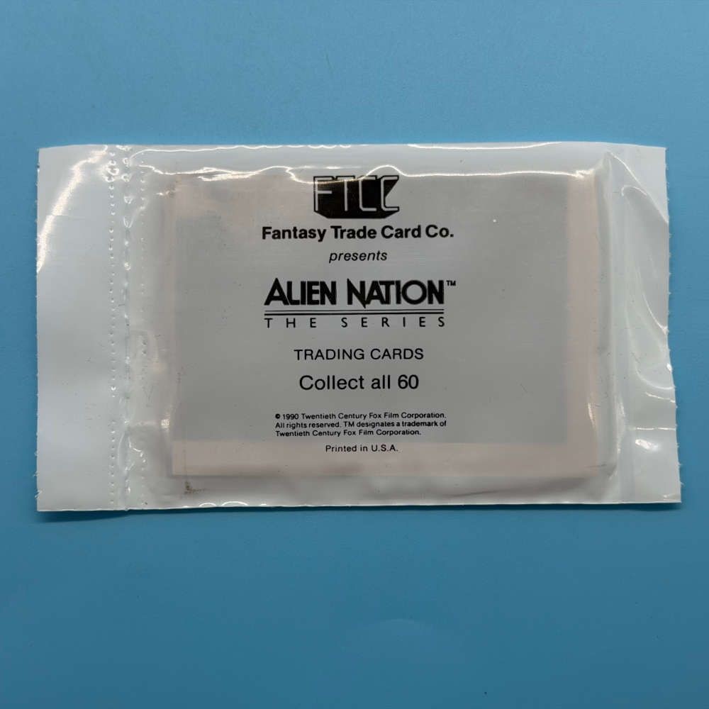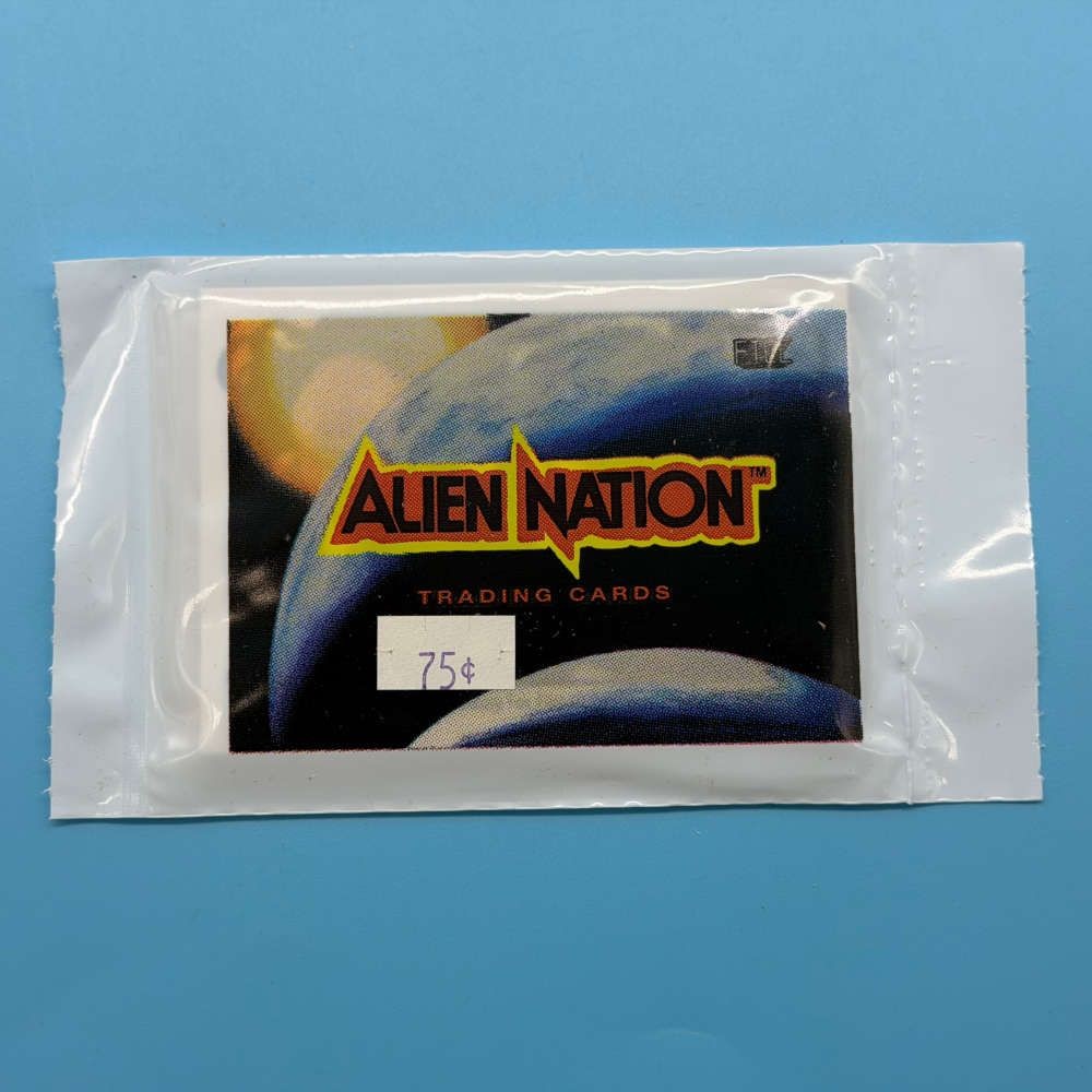 Factory-sealed Alien Nation The Series trading cards packet released by the Fantasy Trade Card Company in 1990. Based on the Twentieth Century Fox television series, each packet includes a selection of cards from the 60-card base set. Features scenes, characters, and production imagery from the show. Price sticker remains on the front of this packet as shown.