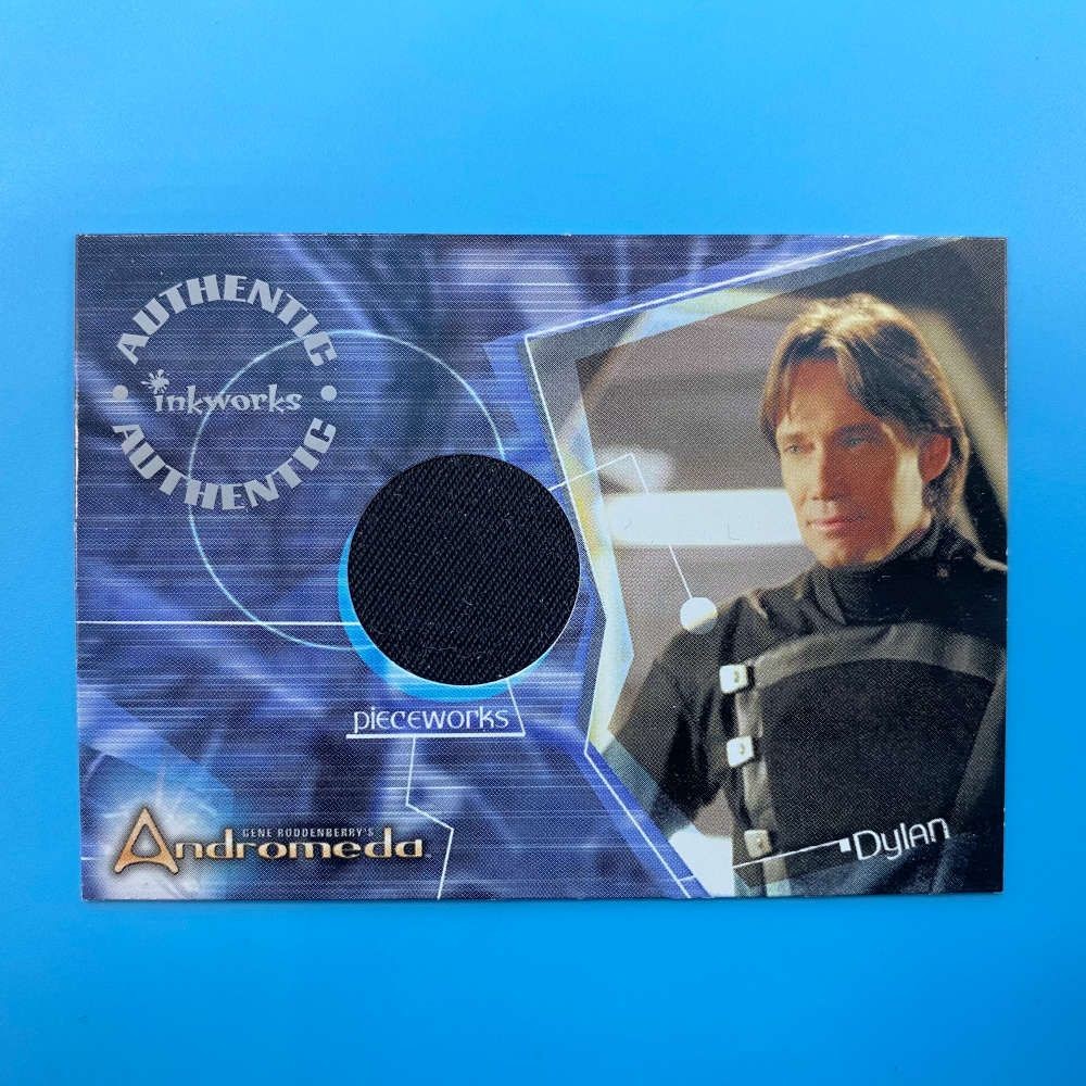 Andromeda Pieceworks costume card PW5 by Inkworks (2001), featuring jacket fabric worn by Kevin Sorbo as Dylan Hunt. Certified screen-used memorabilia from the sci-fi series.