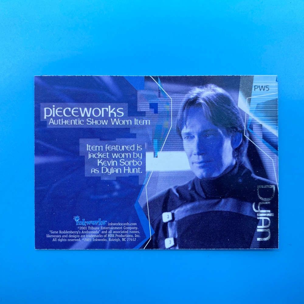 Andromeda Pieceworks costume card PW5 by Inkworks (2001), featuring jacket fabric worn by Kevin Sorbo as Dylan Hunt. Certified screen-used memorabilia from the sci-fi series.