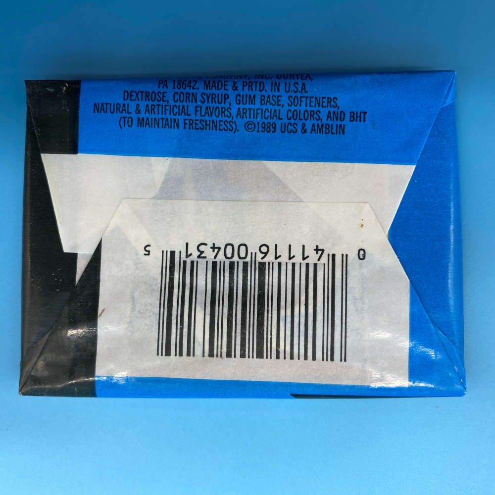 Back to the Future II trading card packet by Topps (1989). Includes 9 movie cards, 1 sticker, and 1 stick of bubble gum. Official UCS and Amblin release.
