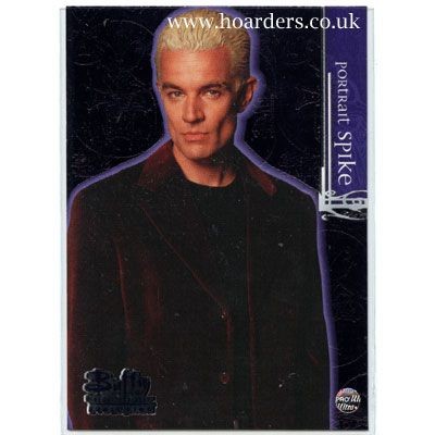 Buffy the Vampire Slayer Evolution Portrait Card PT-9 by Inkworks (2002), featuring Spike in a dark red jacket with embossed purple border and vertical “Portrait Spike” sidebar. This insert card is part of the Portrait subset from the Evolution trading card set. Numbered “PT-9”, it was randomly inserted into sealed packs and showcases the character in a formal studio pose, finished with premium gloss and foil accents.