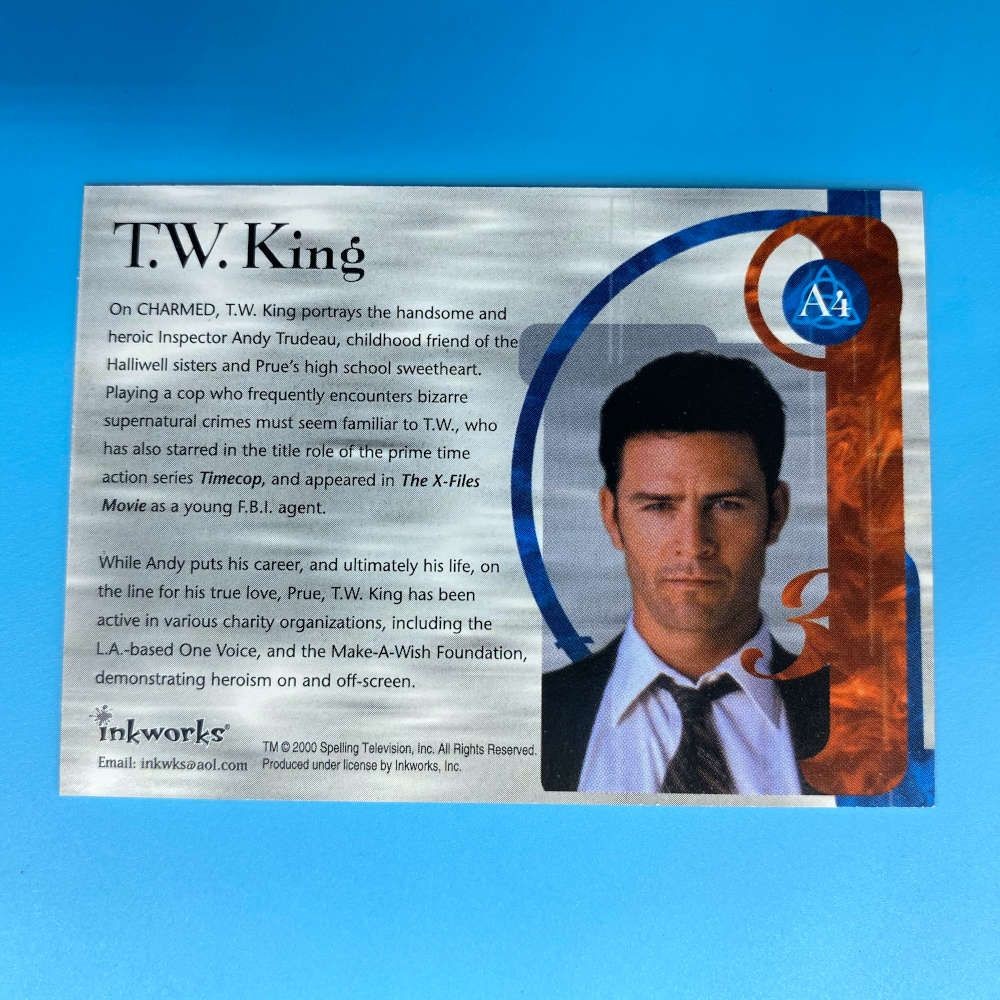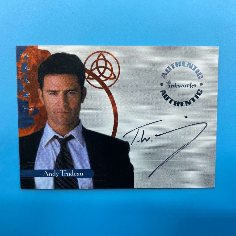 Charmed autograph card of T. W. King as Andy Trudeau by Inkworks (2000). A4 size card featuring actor’s signature. Officially licensed by Warner Bros.