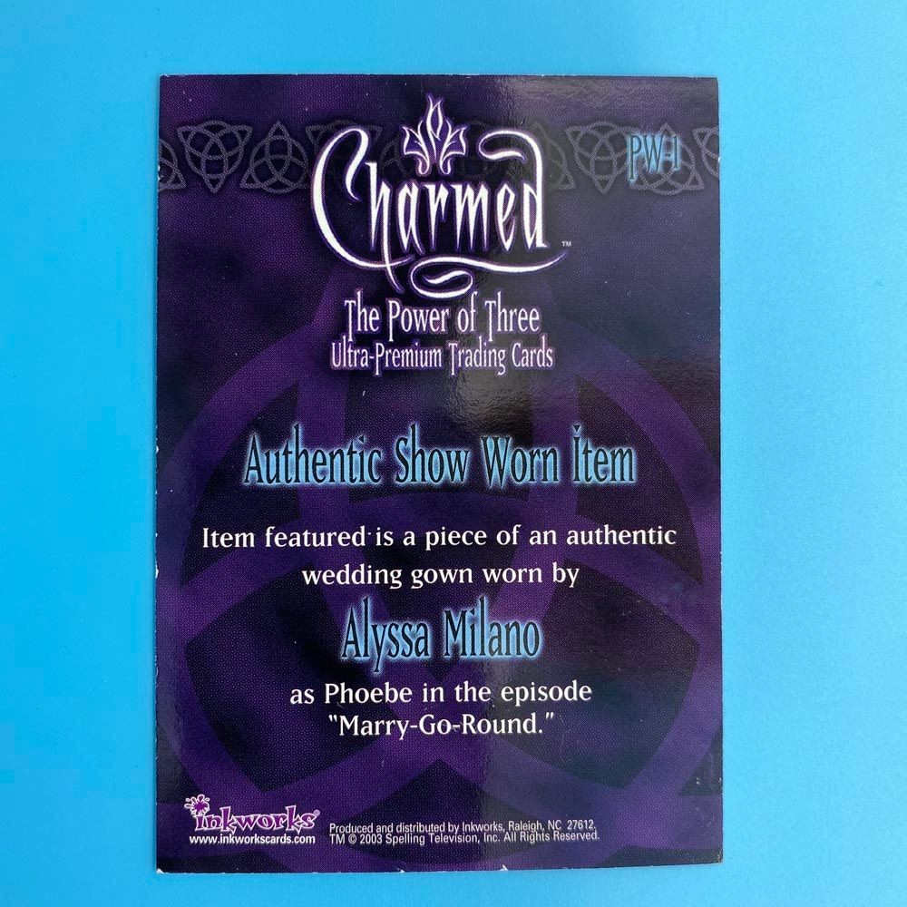 This officially licensed Charmed costume card contains a piece of authentic wedding gown worn by Alyssa Milano as the character Phoebe Halliwell in the episode “Marry-Go-Round.” Manufactured by Inkworks in 2003, this card (PW-1) is part of The Power of Three series and features a show-worn fabric swatch alongside a scene image from the episode.