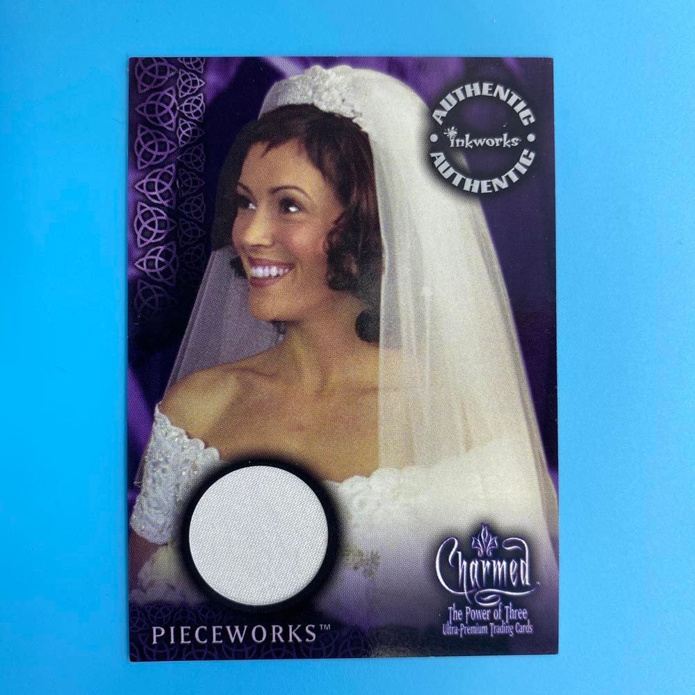 Authentic costume card featuring a piece of wedding gown worn by Alyssa Milano as Phoebe in Charmed. Issued as PW-1 by Inkworks in 2003.