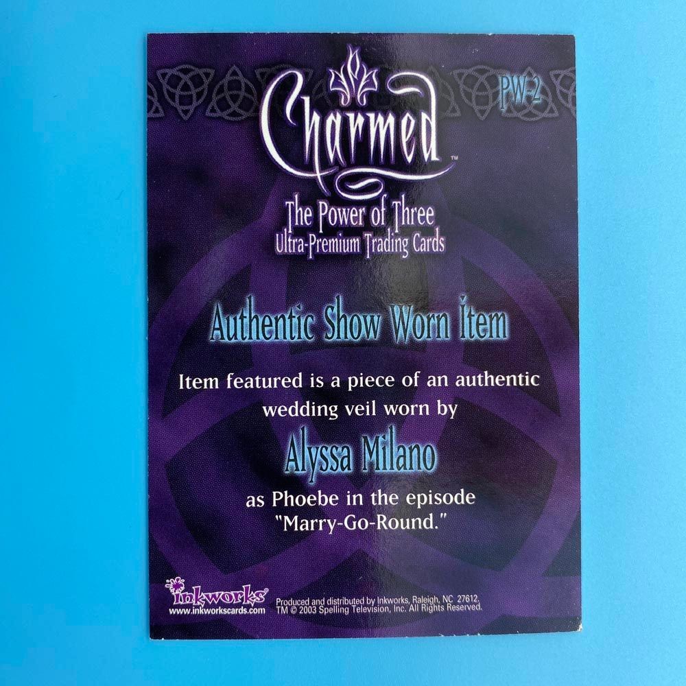 Authentic costume card featuring a piece of wedding veil worn by Alyssa Milano as Phoebe in Charmed. Issued as PW-2 by Inkworks in 2003.