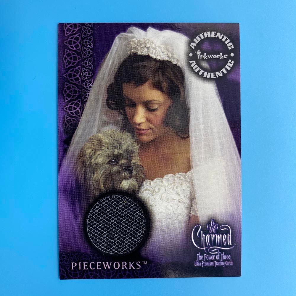This officially licensed Charmed costume card contains a piece of authentic wedding veil worn by Alyssa Milano as the character Phoebe Halliwell in the episode “Marry-Go-Round.” Manufactured by Inkworks in 2003, this card (PW-2) is part of The Power of Three series and includes a show-worn fabric swatch with imagery from the episode.