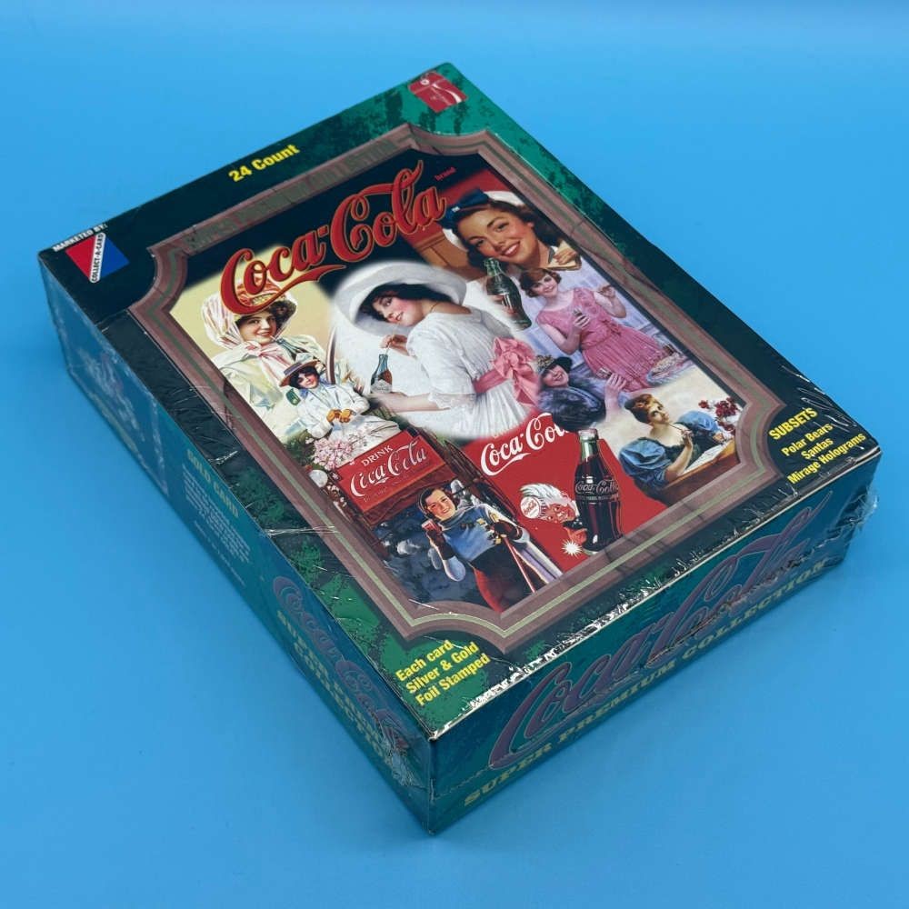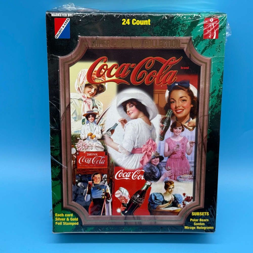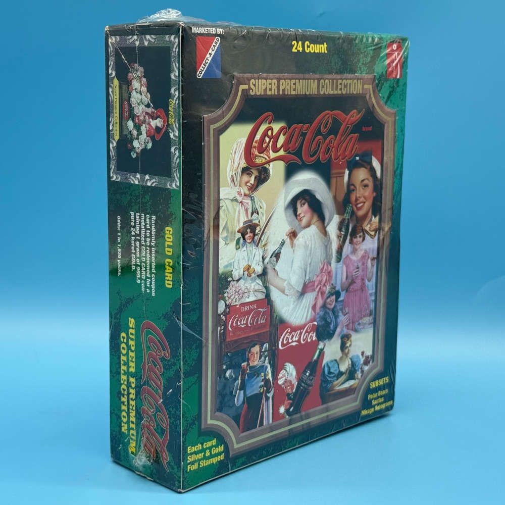 Coca-Cola Super Premium Collection box by Collect-A-Card (1995). Factory sealed. 24 packets of 8 foil-stamped cards. Look for Santas, Bears, holograms.