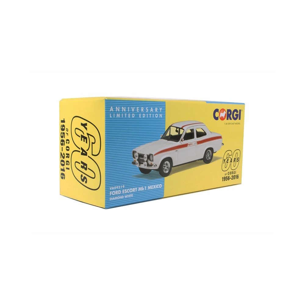 Corgi 1:43 scale Ford Escort Mk1 Mexico in Diamond White from the 60th Anniversary range. Includes collector’s card and enamel pin badge in original packaging.