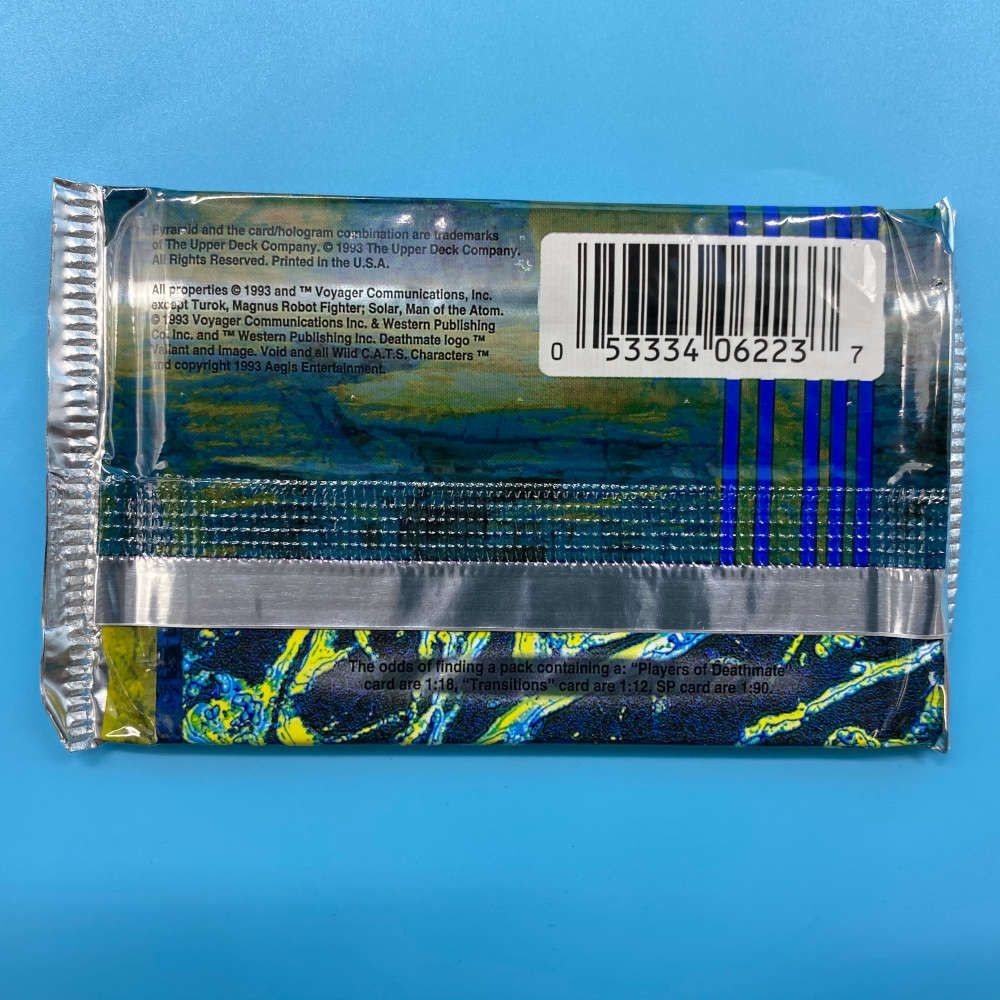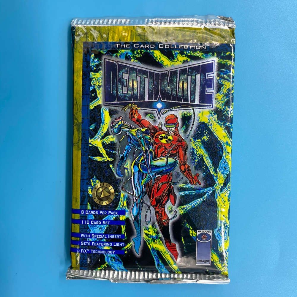 Trading card packet from DeathMate The Card Collection, released by Upper Deck in 1993. Based on the crossover comic series between Valiant and Image Comics, the set features dynamic comic art and special FX card technology. Each packet contains 8 cards from a 110-card base set, with randomly inserted Transition cards, Player of Deathmate cards, and SP insert cards.