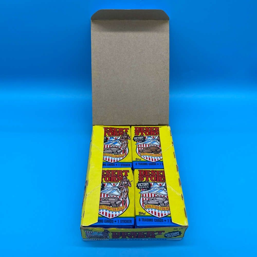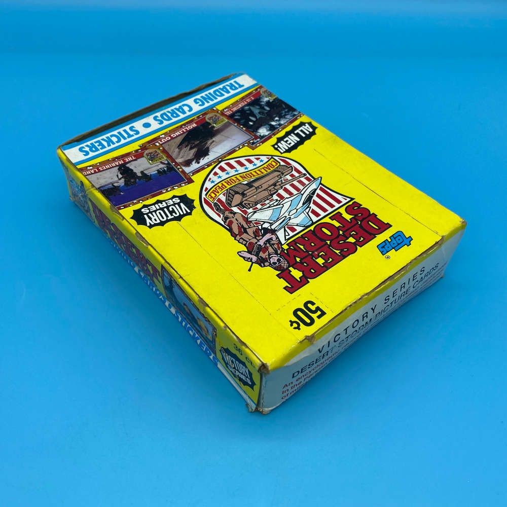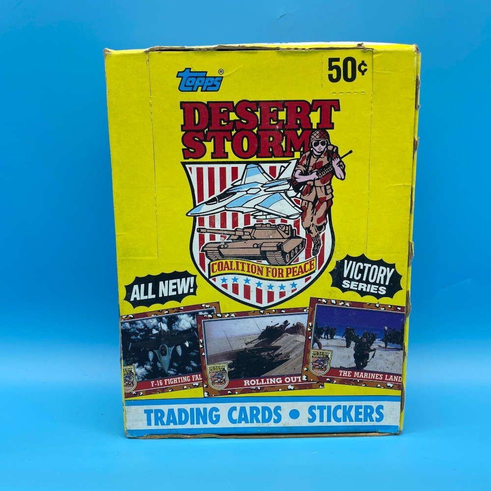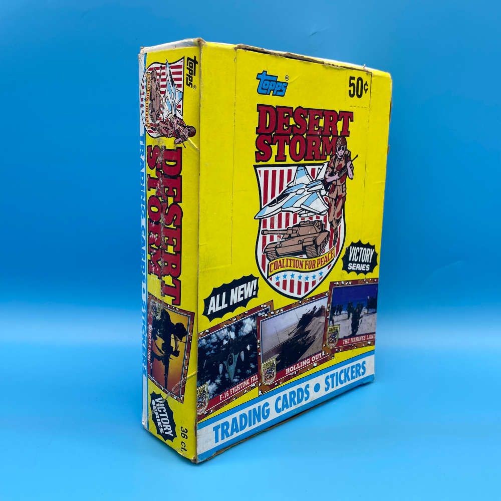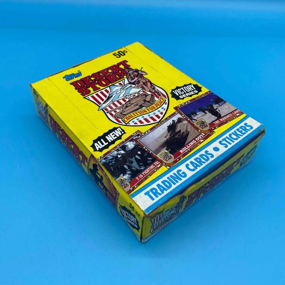 Desert Storm Victory Series box by Topps (1991). Includes 36 packets with 8 cards and 1 sticker per pack. Covers Gulf War leaders, weapons, and key events.