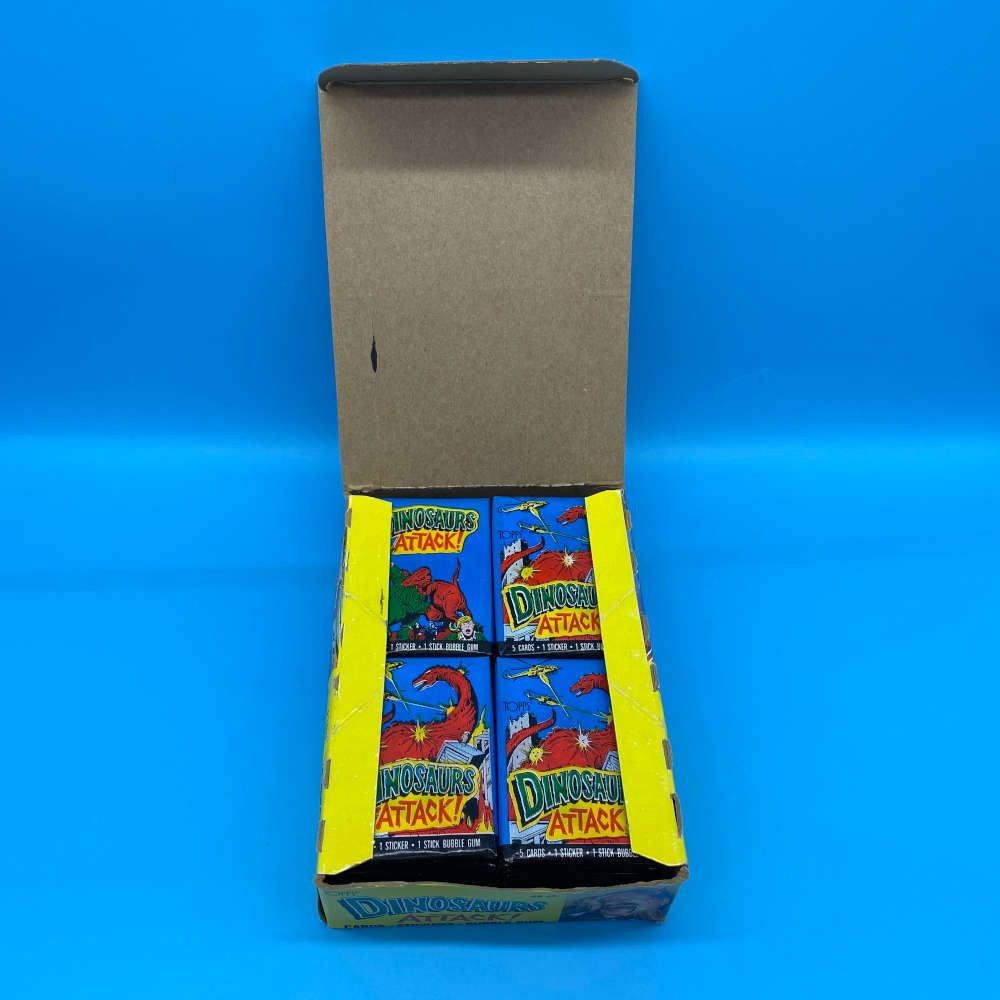 Dinosaurs Attack! trading card box by Topps (1988). 48 packs with 5 cards, 1 sticker, and bubble gum. Outer box worn, cards inside should be fine.