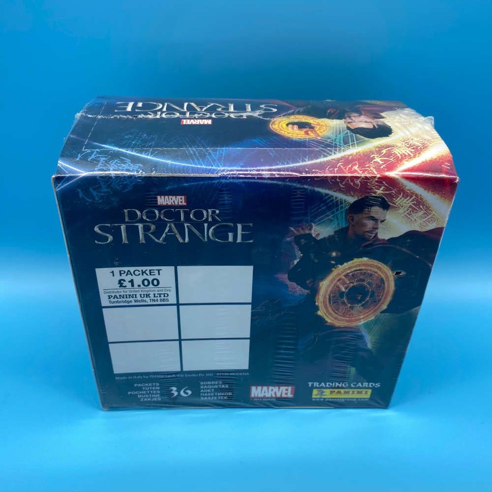 Doctor Strange trading cards box by Panini (2016), featuring 36 packets. Based on the Marvel Studios film. Includes character cards and film stills.