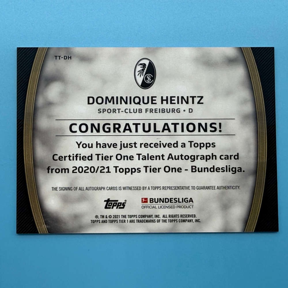 Product Details: Product Name: Dominique Heintz Tier One Talent Autograph Card – Sport-Club Freiburg Series/Set: Topps Tier One – Bundesliga 2020/21 Card Type: Tier One Talent Autograph card Player: Dominique Heintz Team: Sport-Club Freiburg Card Code: TT-DH Serial Number: 004/100 Manufacturer: Topps Release Year: 2021 Licensing: © Bundesliga / Topps