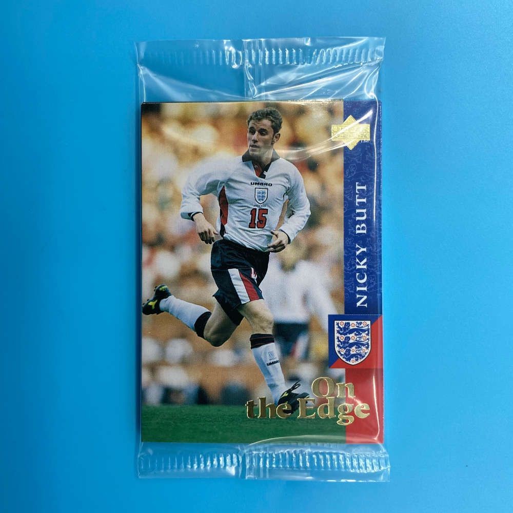 This sealed single packet from the 1997/98 England – Three Lions Upper Deck collection features David Beckham card #18. Issued during Beckham’s early years with the England national team, the card highlights his midfield performance and potential, as noted by then-manager Glenn Hoddle. Part of a limited series produced by Upper Deck, the packet remains unopened in original factory wrap.