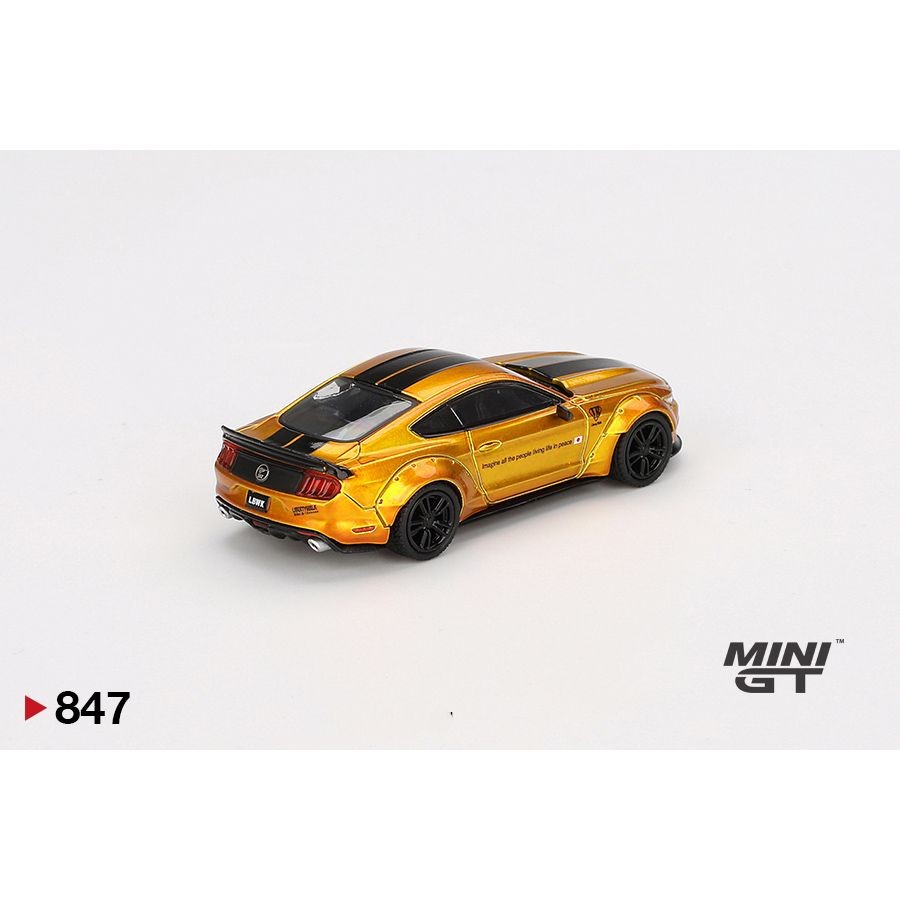 MiniGT Ford Mustang LB-WORKS in gold, 1:64 scale, MGT00847-R. Liberty Walk wide body styling. RHD die-cast model in original display packaging.