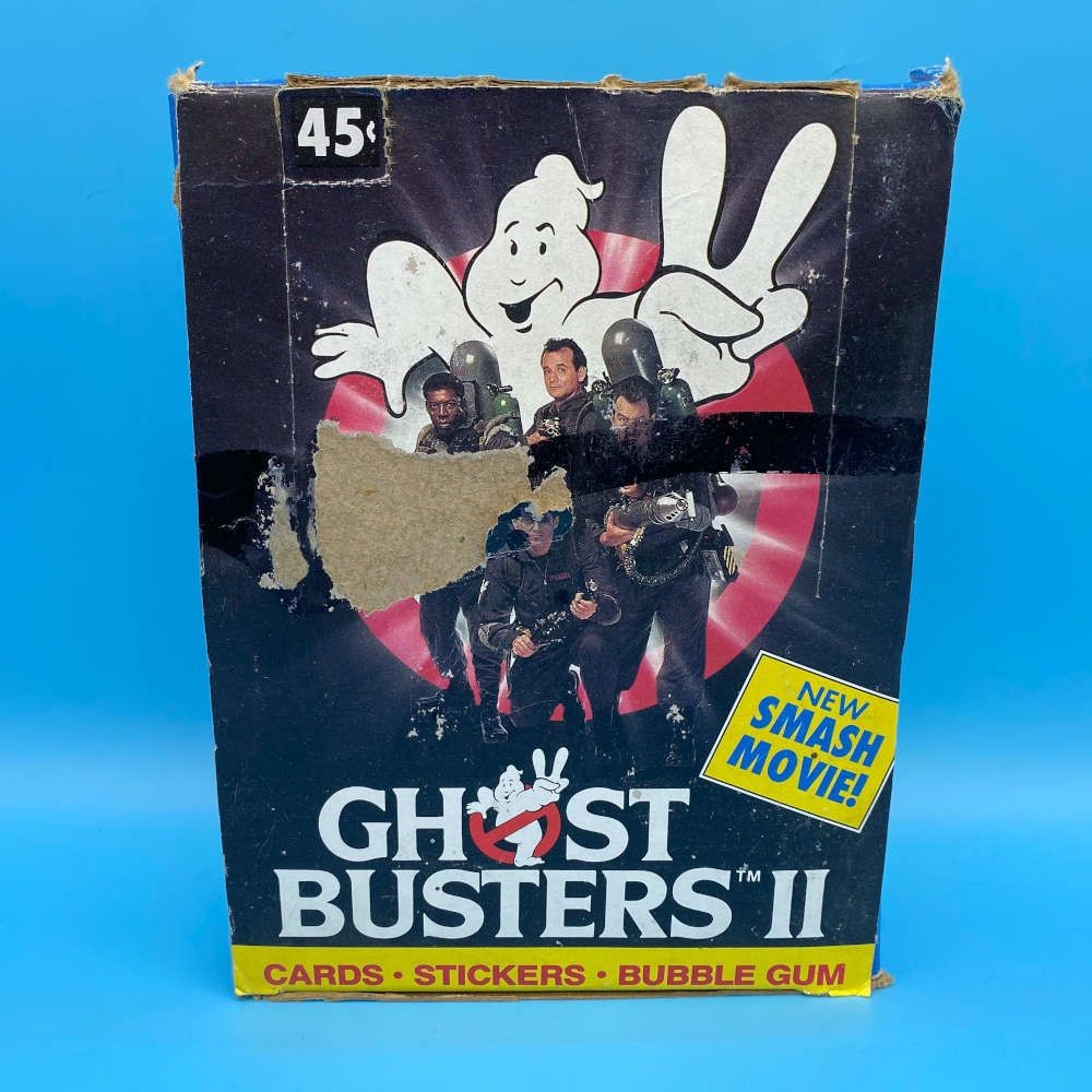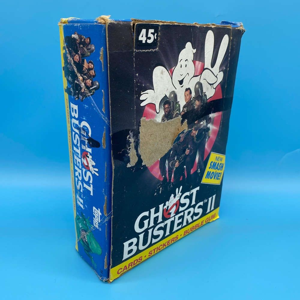 Ghostbusters II trading card box by Topps (1989). Contains 36 packs with 8 cards, 1 sticker, and 1 stick of gum. Boxes show age-related damage.