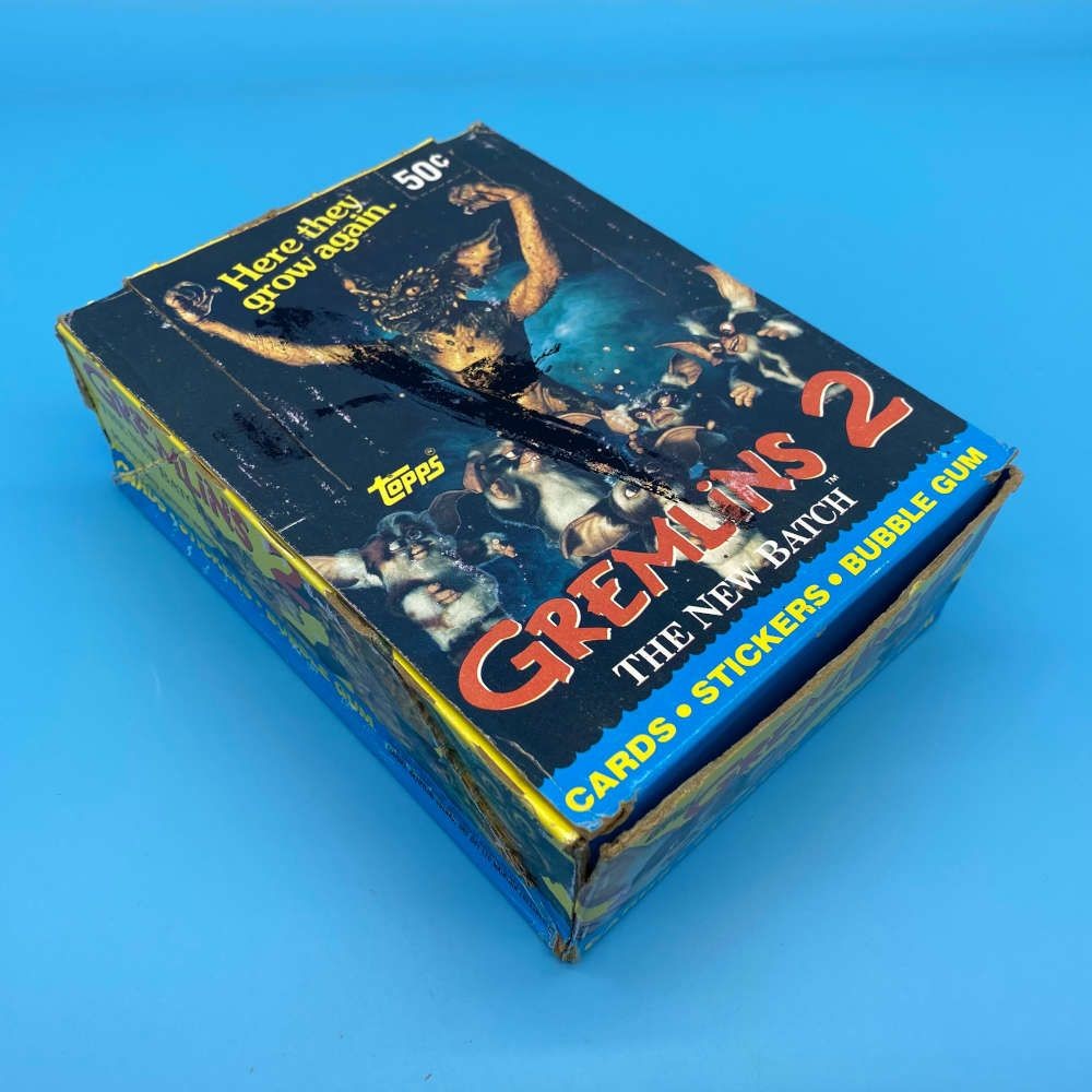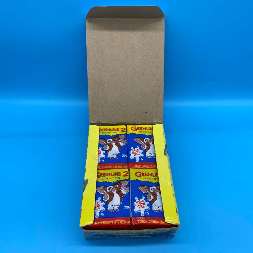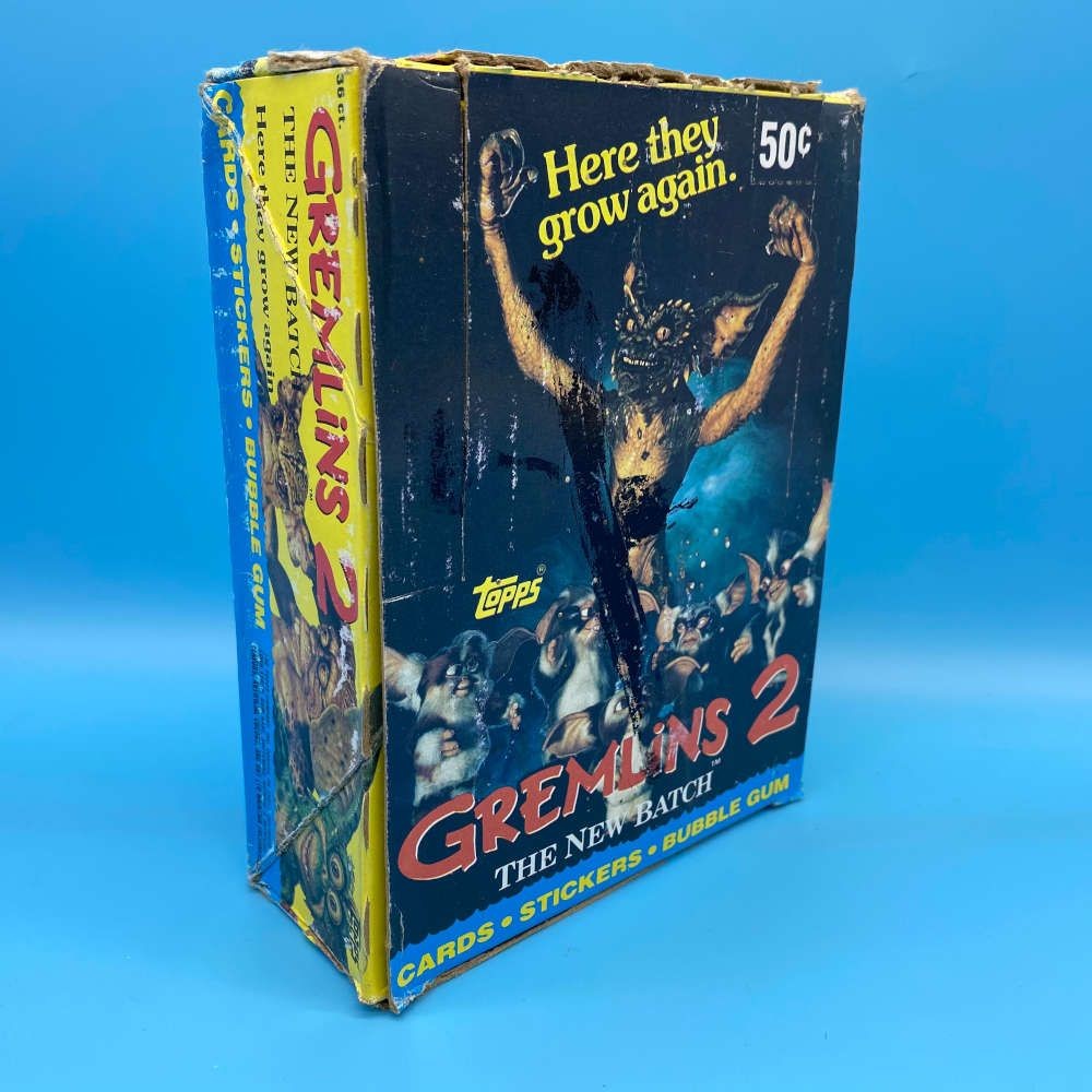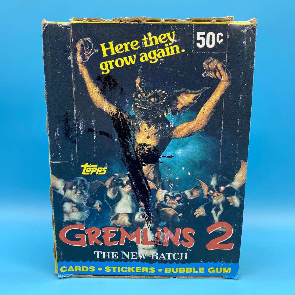 Gremlins 2 The New Batch trading card box by Topps (1990). Includes 36 wax packs with 9 cards, 1 sticker, and 1 stick of bubble gum. Two wrapper designs included.