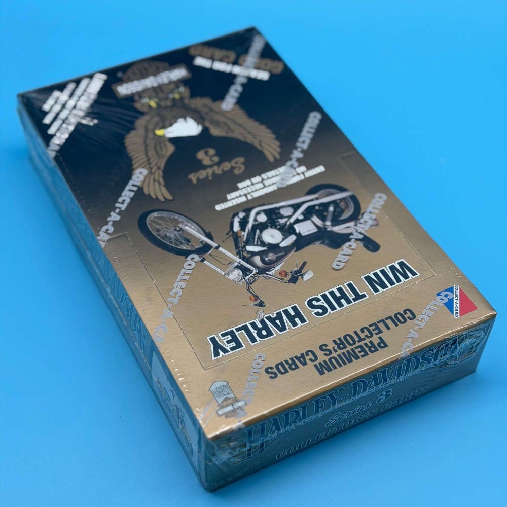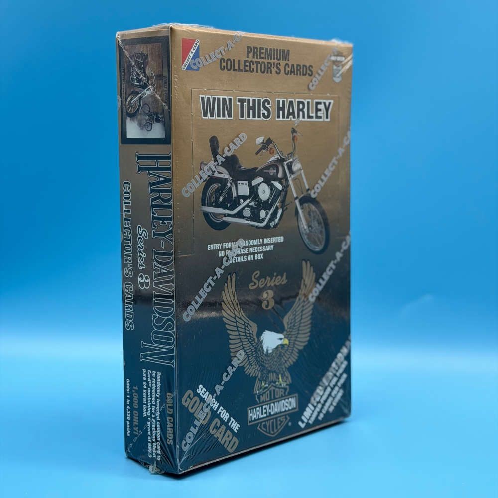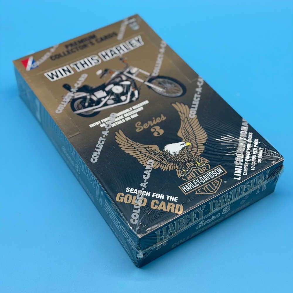 Harley-Davidson Series 3 trading cards box by Collect-A-Card, released in 1993. This limited collector’s edition includes 36 sealed packs, each containing 10 cards featuring iconic Harley-Davidson motorcycles, riders, and company heritage. Collectors could also search for the special “Golden Card” randomly inserted within the set. Officially licensed by Harley-Davidson Motor Company and printed in the USA.
