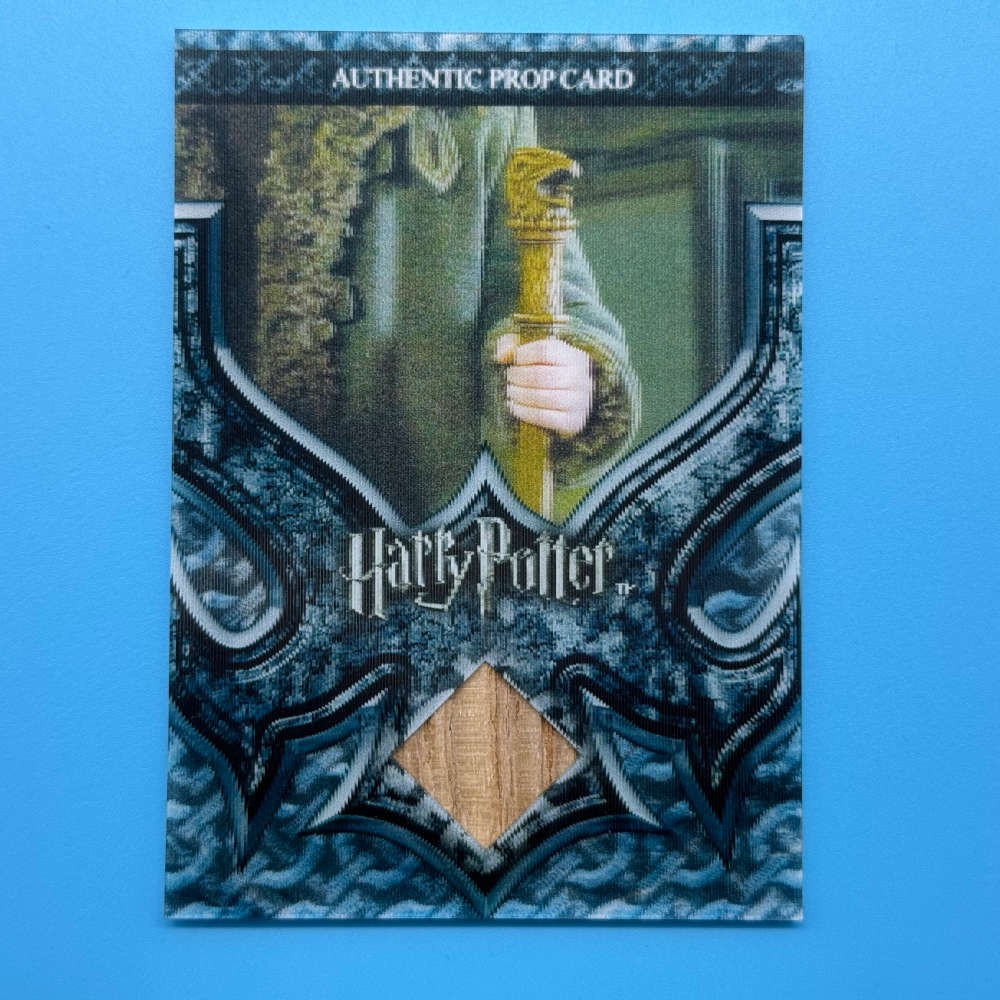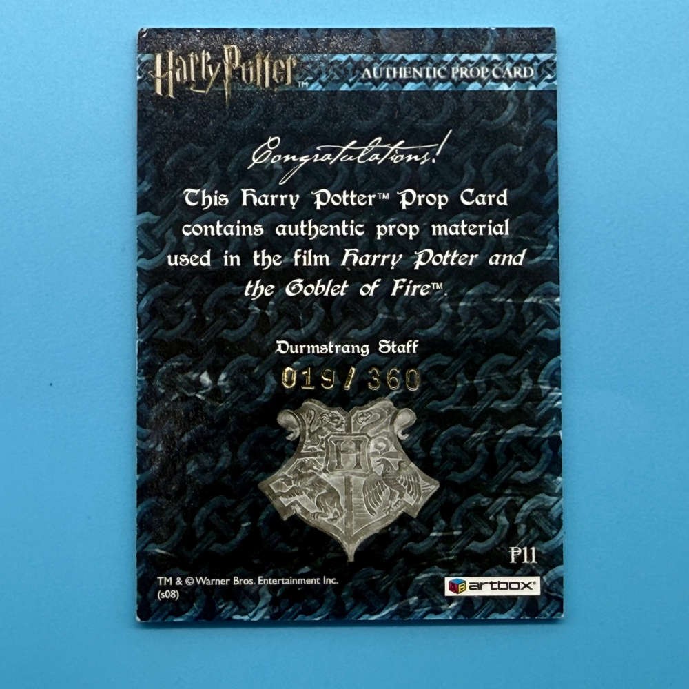 Released by Artbox in 2008 as part of Harry Potter 3D Series 2, this P11 prop card contains genuine wood from the Durmstrang Staff, as featured in Harry Potter and the Goblet of Fire. Each card is individually numbered—this is 019/360. Officially licensed and part of a limited run.