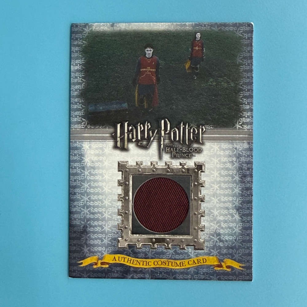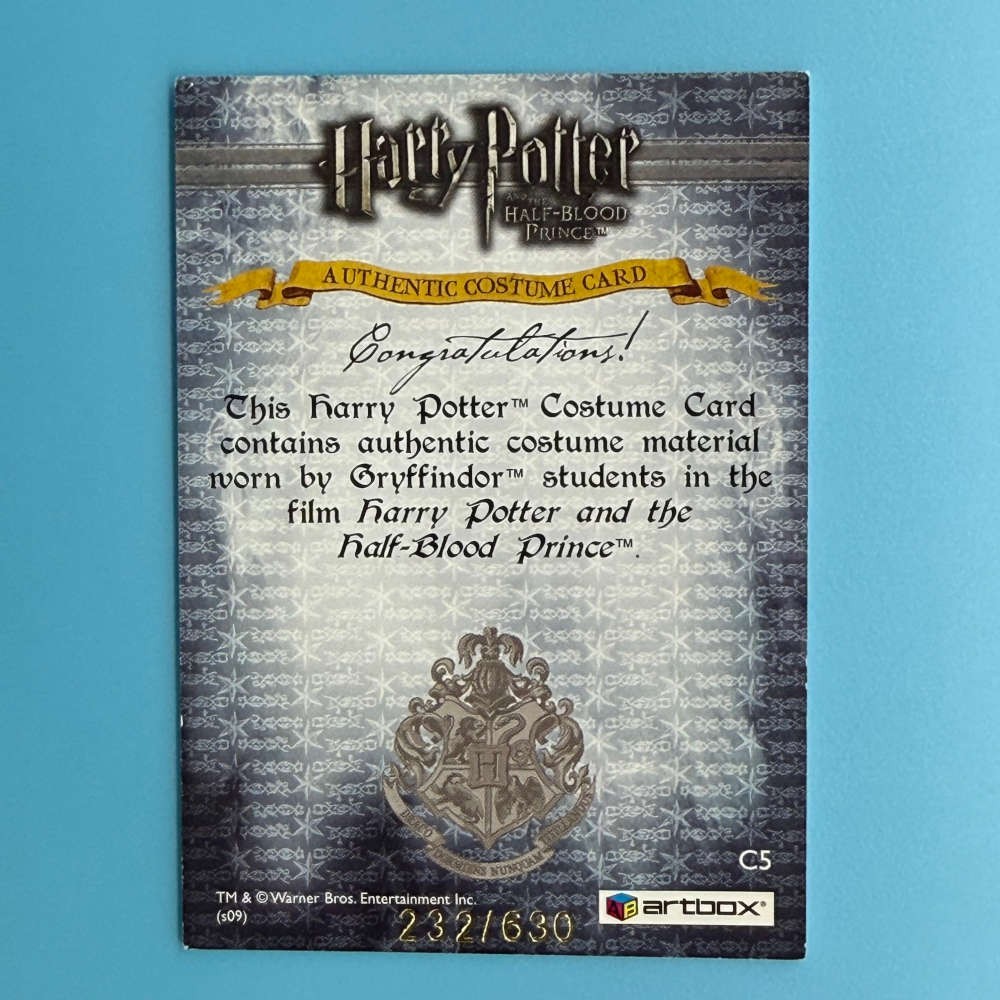 Harry Potter costume card C5 232/630 from Artbox (2009), featuring screen-worn fabric worn by Gryffindor students in Half-Blood Prince. Authentic licensed card. This authentic costume card was released by Artbox in 2009 as part of the Harry Potter and the Half-Blood Prince trading card series. Numbered 232/630, the card contains genuine costume material worn by Gryffindor students in the film. The front features an image from a Quidditch scene, with maroon uniform fabric encased in a decorative metal-style frame. The card is foil-stamped and officially licensed by Warner Bros.