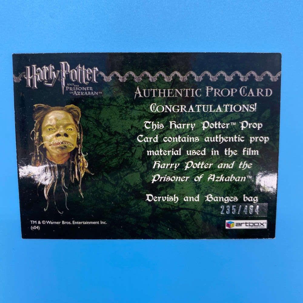 Authentic prop card from Harry Potter and the Prisoner of Azkaban featuring material from a Dervish and Banges bag. Numbered 235/484. Made by Artbox in 2004.