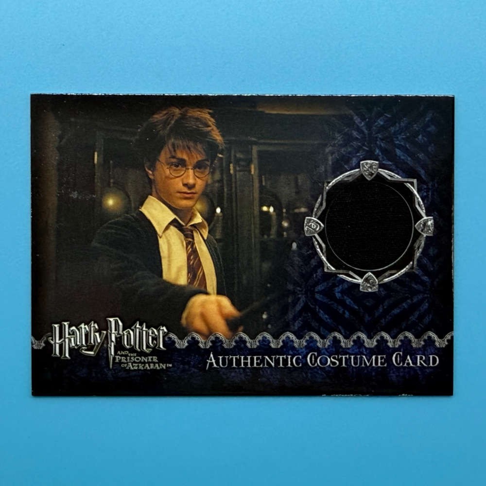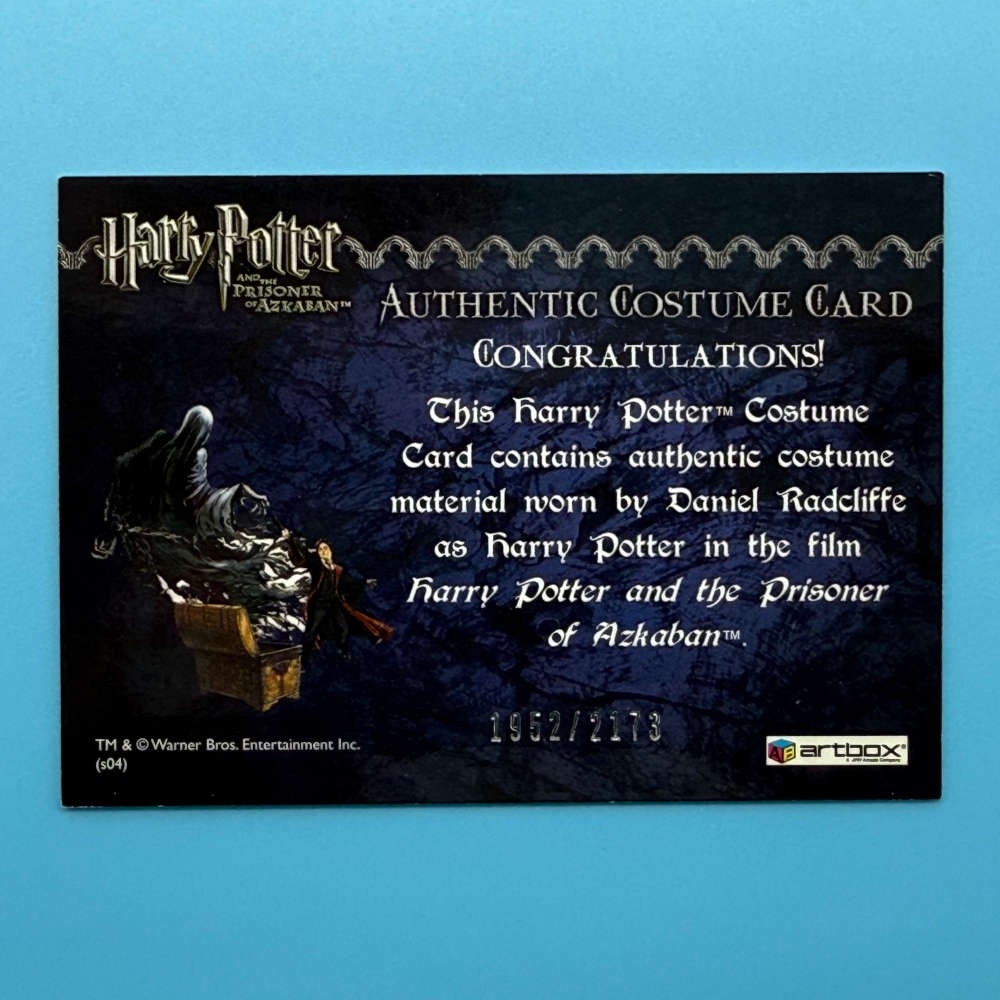 Authentic costume card from Artbox (2004) featuring screen-worn fabric by Daniel Radcliffe as Harry Potter. Limited edition 1952/2173 from Prisoner of Azkaban.