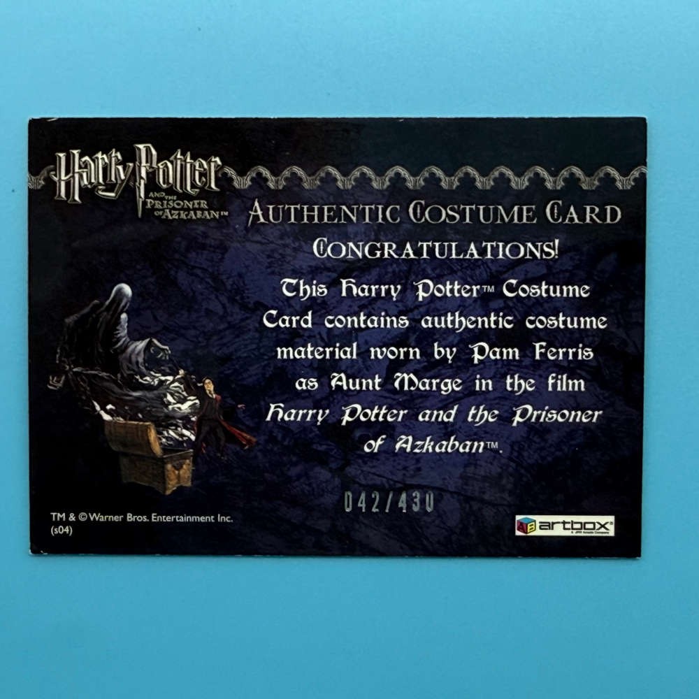 Official memorabilia card from Harry Potter and the Prisoner of Azkaban, released by Artbox in 2004. This authentic costume card contains a swatch of screen-worn fabric from the outfit worn by Pam Ferris as Aunt Marge, featured during her memorable inflation scene. The card is individually numbered 042/430 and displays a decorative foil-stamped frame with a full-character photo on the front. Please note: there is damage to the bottom-left corner on the reverse side of the card, not visible from the front.