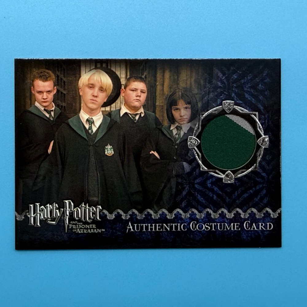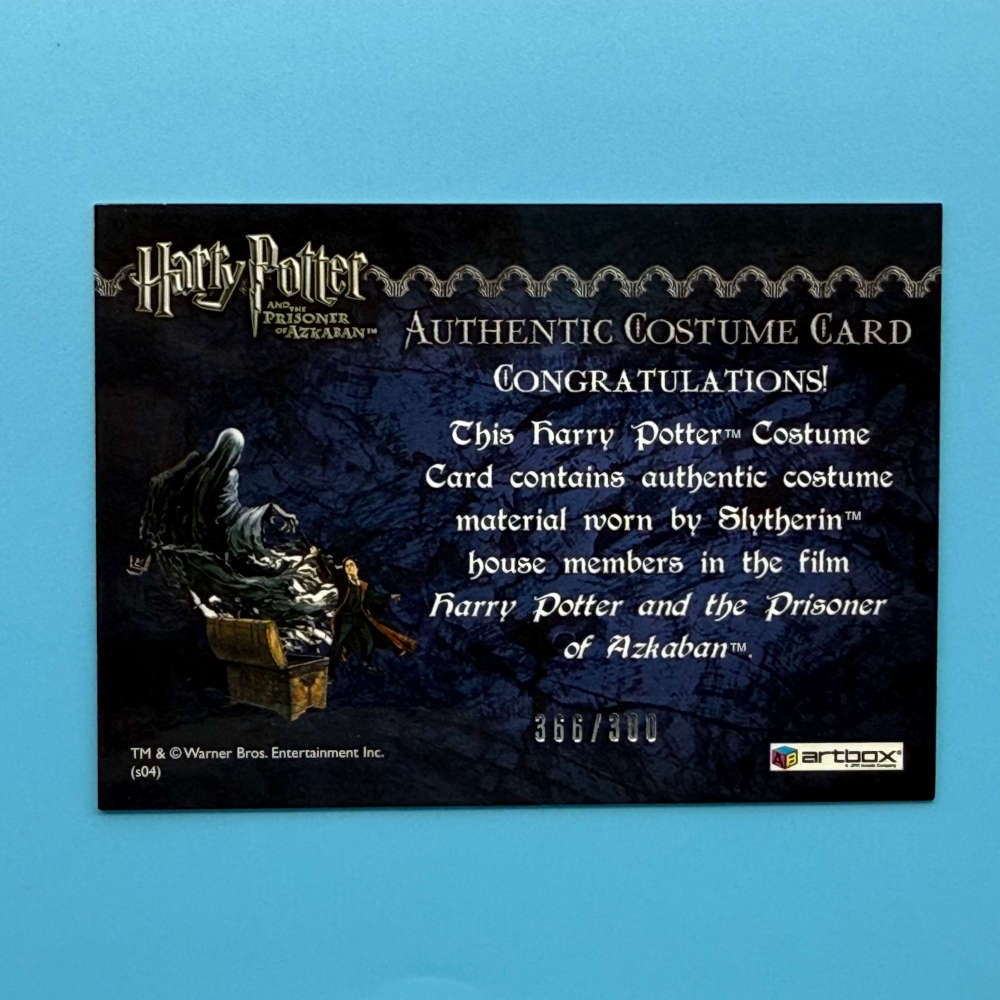 Official costume card released by Artbox in 2004 for Harry Potter and the Prisoner of Azkaban. This card includes authentic green and silver-trimmed costume fabric worn by a Slytherin house member, with a full-colour cast photo including Draco Malfoy (Tom Felton). Individually numbered 366/380. Part of the authorised Artbox memorabilia collection.