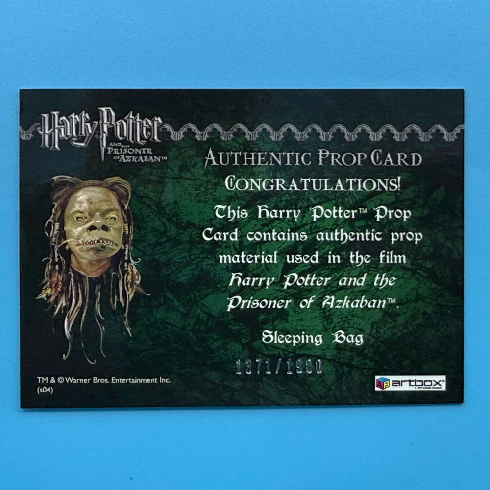 Authentic prop card from Harry Potter and the Prisoner of Azkaban by Artbox (2004), featuring fabric from a sleeping bag used in the film. Serial numbered 1371/1980.
