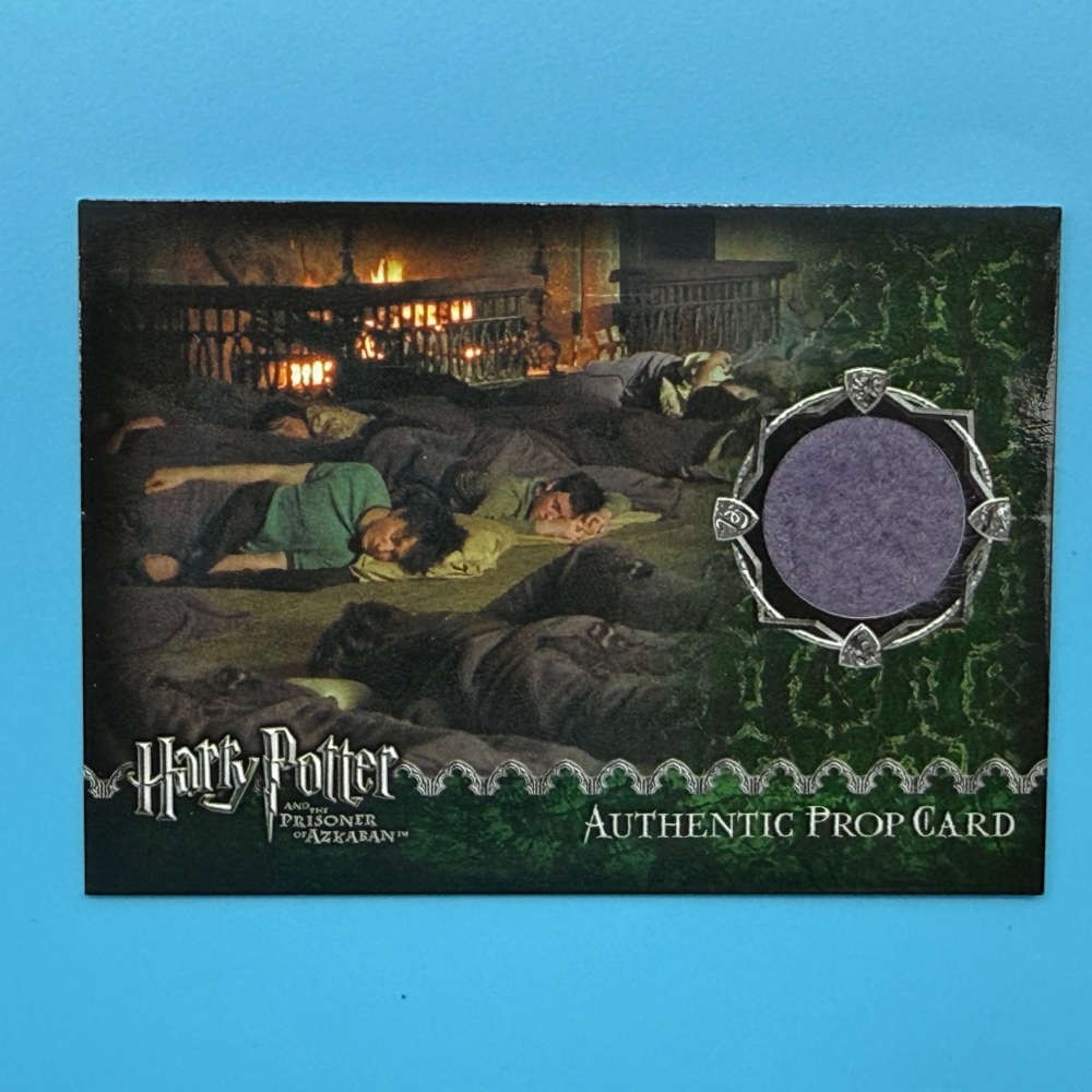 This officially licensed prop card includes material taken from an actual sleeping bag used in the Gryffindor Common Room scene of Harry Potter and the Prisoner of Azkaban. Released by Artbox in 2004, the card displays a circular window with a swatch of purple sleeping bag fabric and a full-colour image from the scene. The reverse includes a certification of authenticity and unique serial number 1371 of 1980.