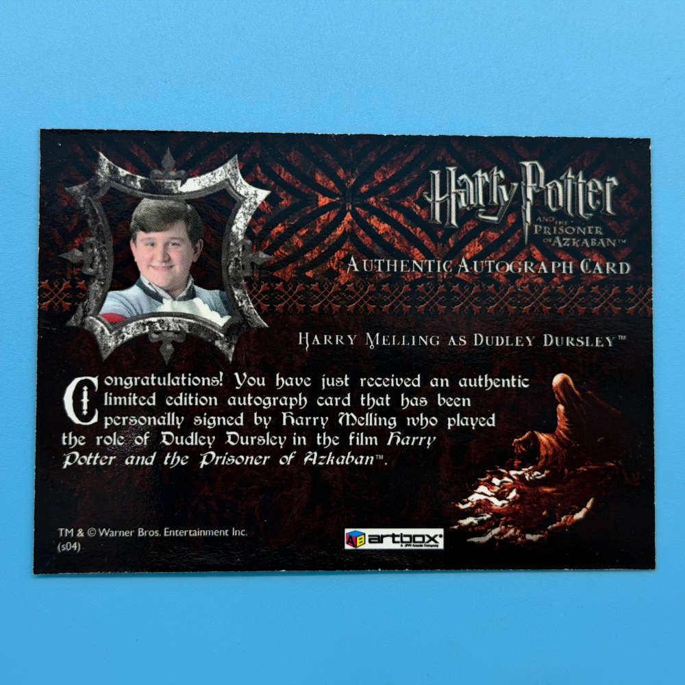 Harry Potter and the Prisoner of Azkaban Update autograph card released by Artbox in 2004. This certified autograph features Harry Melling, who portrayed Dudley Dursley in the third Harry Potter film. The card is part of the Artbox Prisoner of Azkaban Update set, produced as a follow-up release to the main series, and autograph cards were randomly inserted into packs. Artbox autograph cards from this era feature on-card signatures and are officially licensed by Warner Bros.