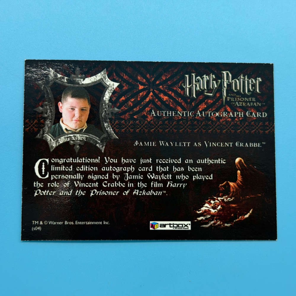 Product Details: Product Name: Harry Potter and the Prisoner of Azkaban Update Autograph Card – Vincent Crabbe Franchise: Harry Potter Series/Set: Harry Potter and the Prisoner of Azkaban – Update Card Type: Autograph card Character: Vincent Crabbe Actor: Jamie Waylett Format: Single trading card Manufacturer: Artbox Release Year: 2004 Licensing: © Warner Bros.
