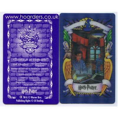 Harry Potter Chocolate Frog Card featuring Christmas at Hogwarts from the 2001 Third Series. Double trademark row and blueish-purple backing. Official release.