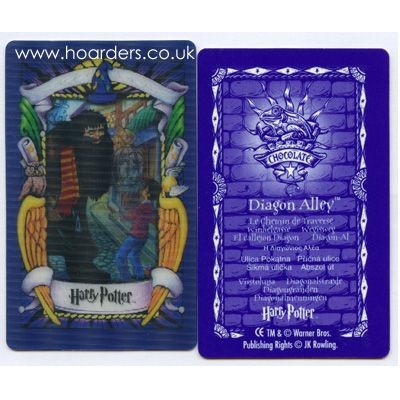 Harry Potter Chocolate Frog Card featuring Diagon Alley from the 2001 Third Series. Double trademark row with pinkish-purple backing. Official Warner Bros. card.