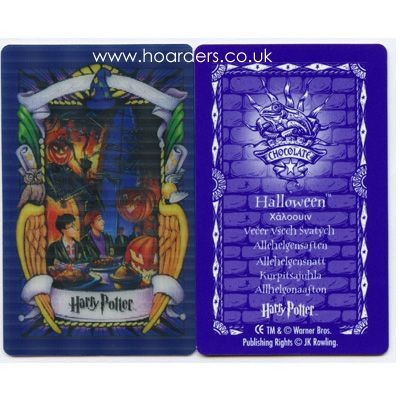 Harry Potter Chocolate Frog Card featuring Halloween from the 2001 Third Series. Double trademark row with pinkish-purple backing. Official Warner Bros. card.