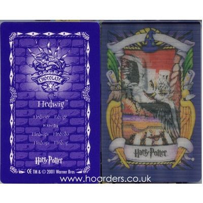 This Harry Potter Chocolate Frog Card features Hedwig the snowy owl and was part of the First Series released in 2001. These early cards are identifiable by their single trademark line, pinkish-purple Type A colouring, and lack of publishing credit to J.K. Rowling. Hedwig appears mid-flight delivering a letter, captured in lenticular motion on the front. The reverse lists translations of the character's name in multiple languages.