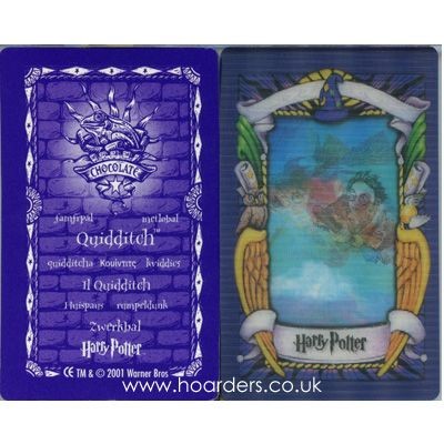 Quidditch card from the Harry Potter Chocolate Frog First Series. Released in 2001 by Warner Bros. with single trademark line and lenticular scene design.