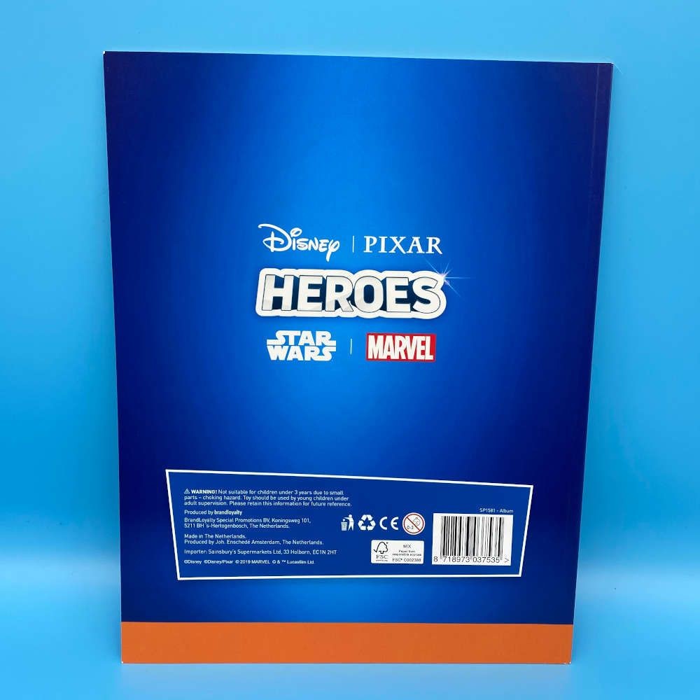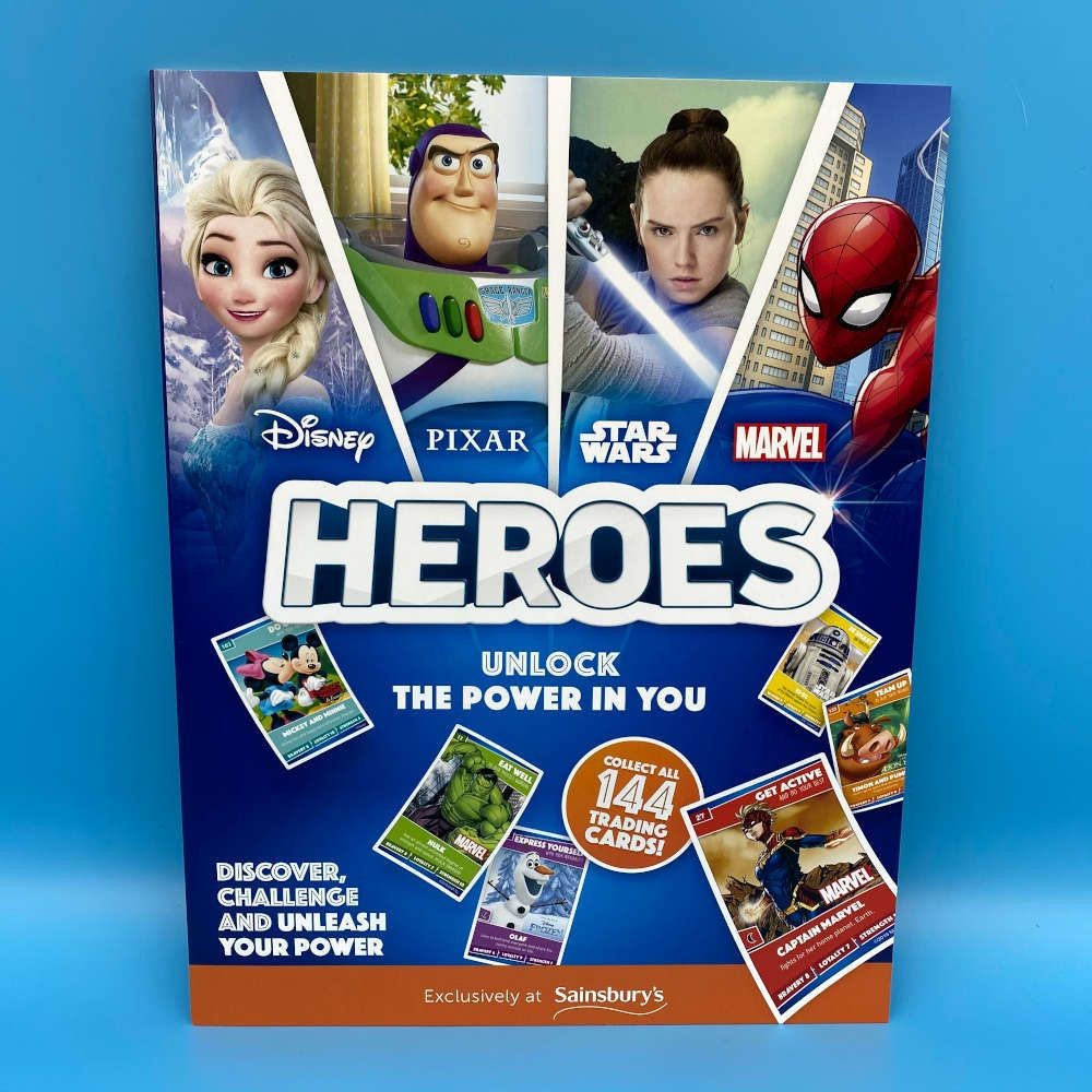 Heroes Collectors Album from 2019, featuring Disney, Pixar, Star Wars, and Marvel franchises. Sainsbury’s exclusive release for 144-card promotional set.