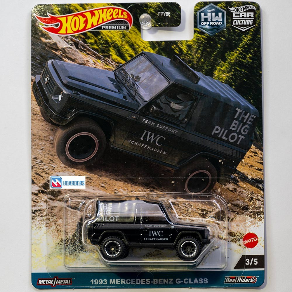 Hot Wheels 1993 Mercedes-Benz G-Class from HW Off Road 3/5. Black IWC livery with Real Riders and metal/metal build. Model HKC72 from 2023 Car Culture set.