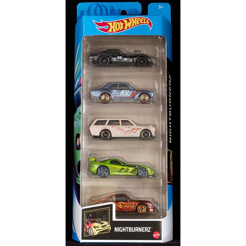 Hot Wheels Nightburnerz 5-pack from 2021. Includes Ford Escort RS1600, Corvette Gas Monkey, Datsun 510 Wagon, Dodge Viper SRT10 ACR, and Porsche 934.