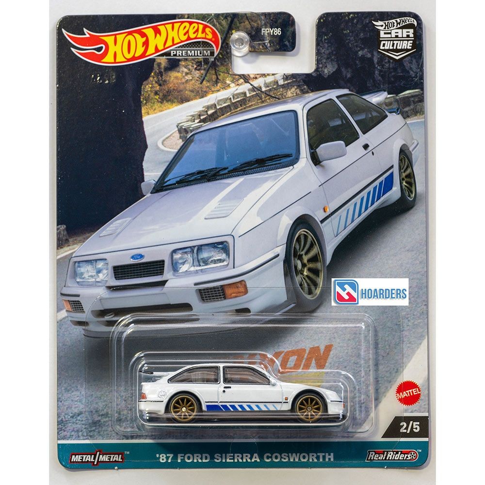 Hot Wheels Car Culture ’87 Ford Sierra Cosworth from the Canyon Warriors series. Premium die-cast with Real Riders wheels and metal/metal construction. This 2/5 release features the iconic Group A rally-style Ford Sierra in white with blue racing stripes, gold wheels, and detailed trim. Part of the 2023 Car Culture line designed for collectors seeking realism and performance.