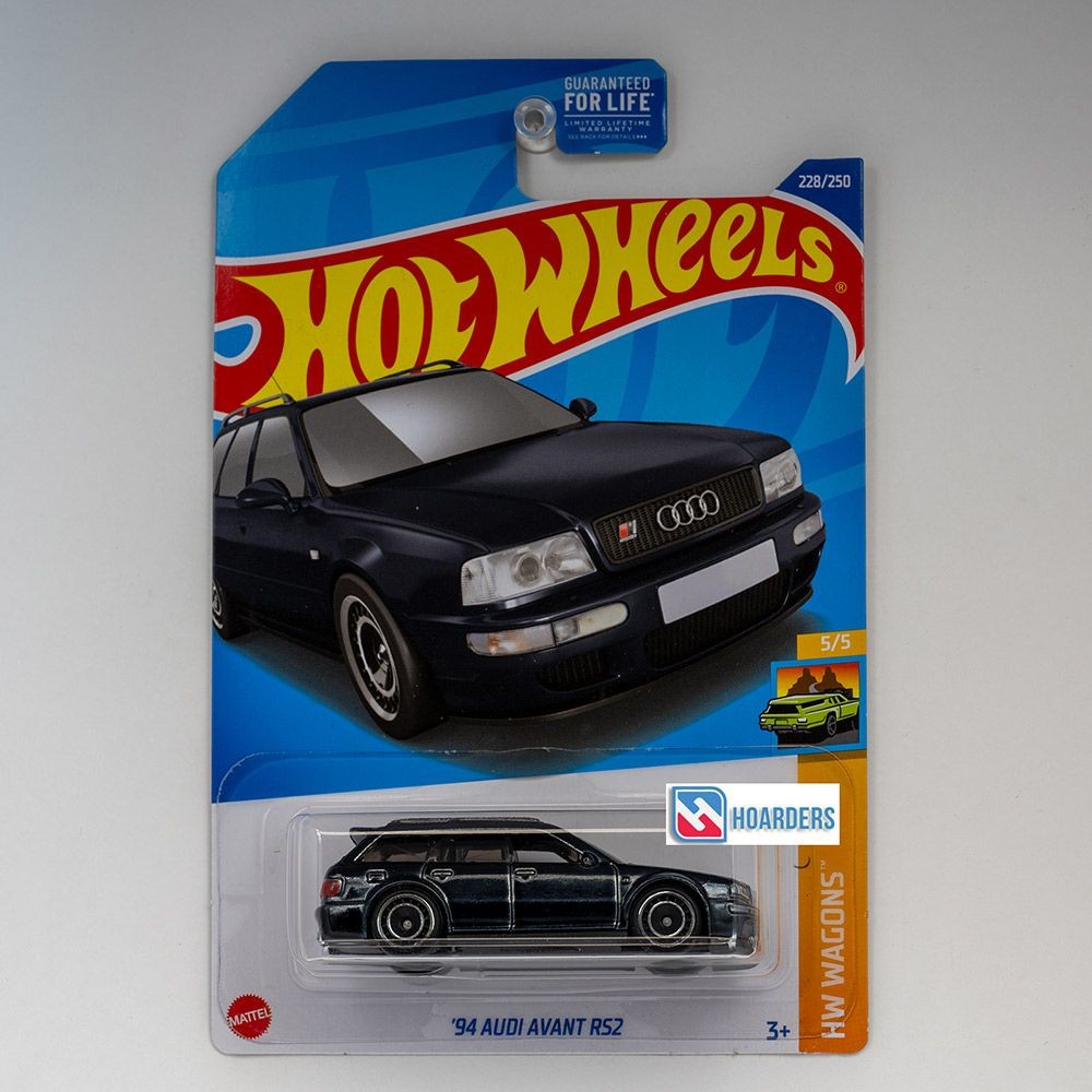Hot Wheels Audi Avant RS2 ’94 Super Treasure Hunt released by Mattel in 2022 as part of the HW Wagons series. This 1:64 scale premium variant features a Spectraflame brilliant black finish, full metal/metal construction, and Real Riders rubber tyres. Numbered 5 of 5 in the HW Wagons subset, this Super Treasure Hunt edition was issued on a long card and represents the premium chase version of the standard release within the 2022 Hot Wheels mainline assortment.