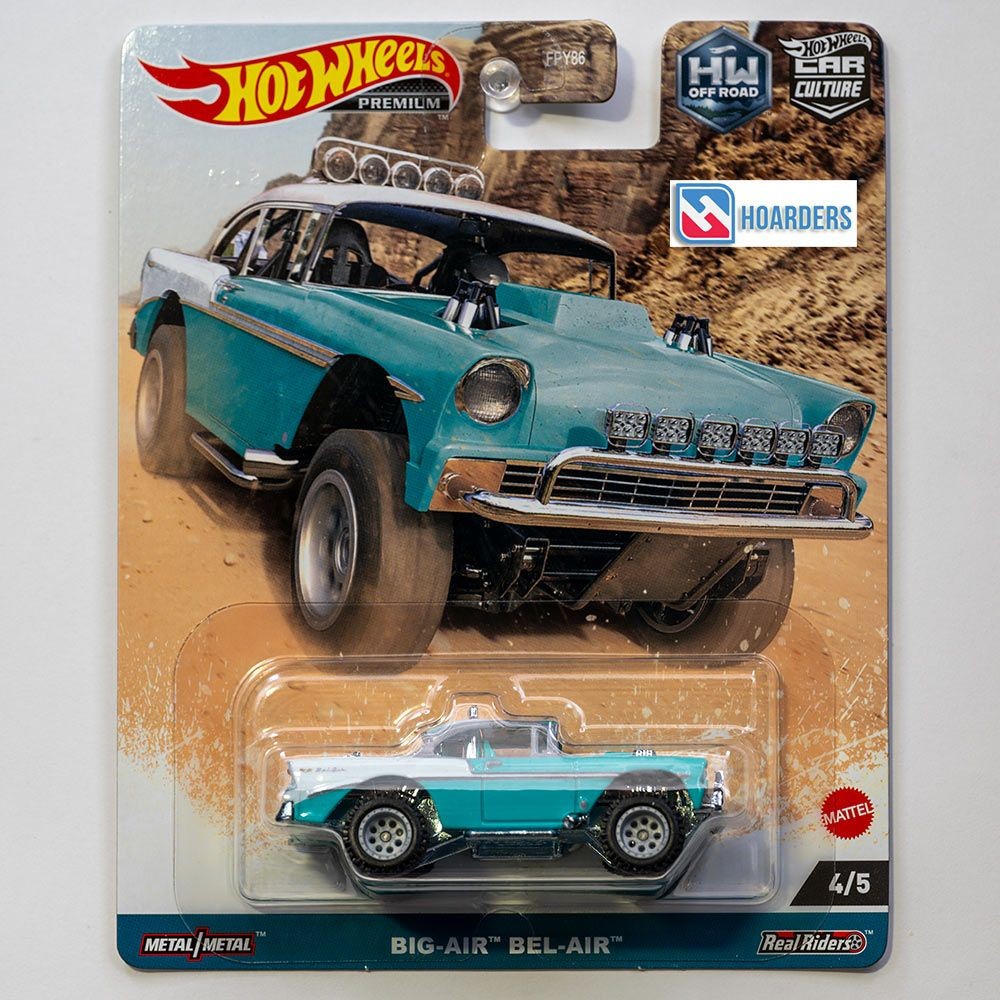 This Hot Wheels Big-Air Bel-Air is part of the HW Off Road series within the premium Car Culture line released in 2023. Numbered 4 of 5 in the set, this rugged 1:64 scale die-cast features lifted suspension, Real Riders off-road wheels, a row of roof-mounted rally lights, and a turquoise and white paint scheme. Designed for desert racing aesthetics, the model is constructed with a metal body and base, and carded under model number HKC74.