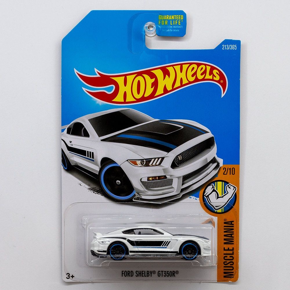 Hot Wheels Ford Shelby GT350R in white from Muscle Mania 2017. Number 213/365 and 2/10 in the sub-series. Features blue-accented rims and black striping.