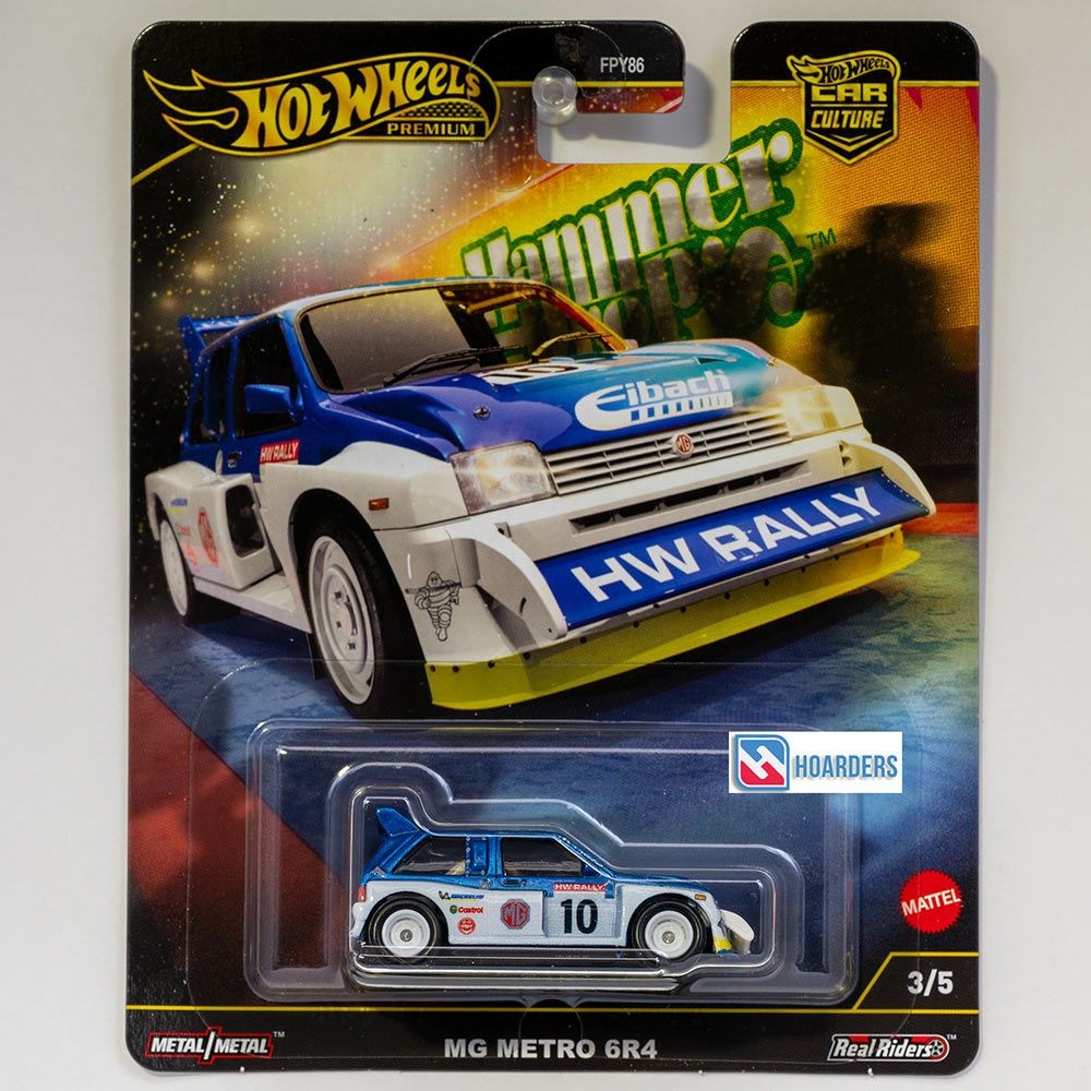Hot Wheels Car Culture MG Metro 6R4 from the Hammer Drop series. Premium die-cast model featuring HW Rally livery, Real Riders rubber tyres, and metal/metal construction. Numbered 3/5 in the series, this release captures the spirit of Group B rally heritage with a detailed replica of the iconic British motorsport car. Includes official Eibach and Hot Wheels branding.