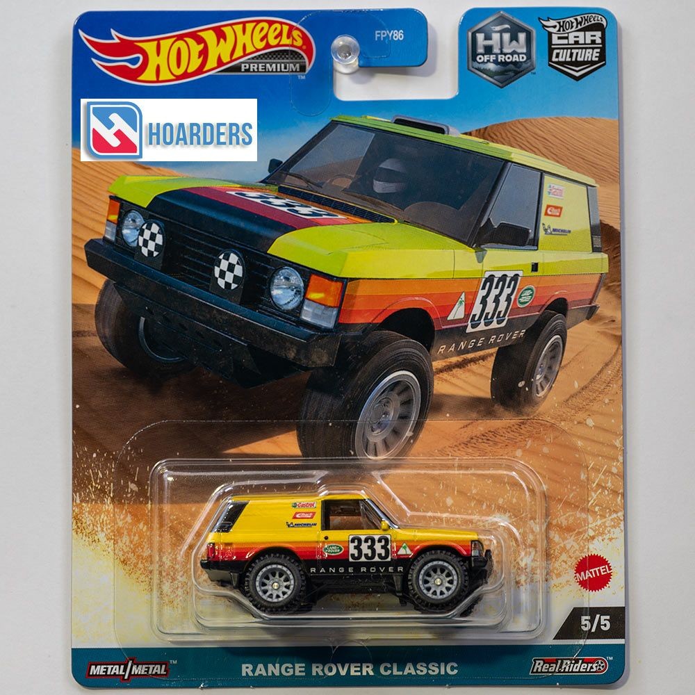 This Hot Wheels Range Rover Classic is part of the HW Off Road sub-series from the premium Car Culture line, released by Mattel in 2023. Numbered 5 of 5 in the set, this 1:64 scale die-cast features rally-style graphics, including the number 333, checkerboard accents, and vibrant red, yellow, and green striping. The model includes full metal body and base construction, Real Riders off-road wheels, and is carded under model number HKC71.