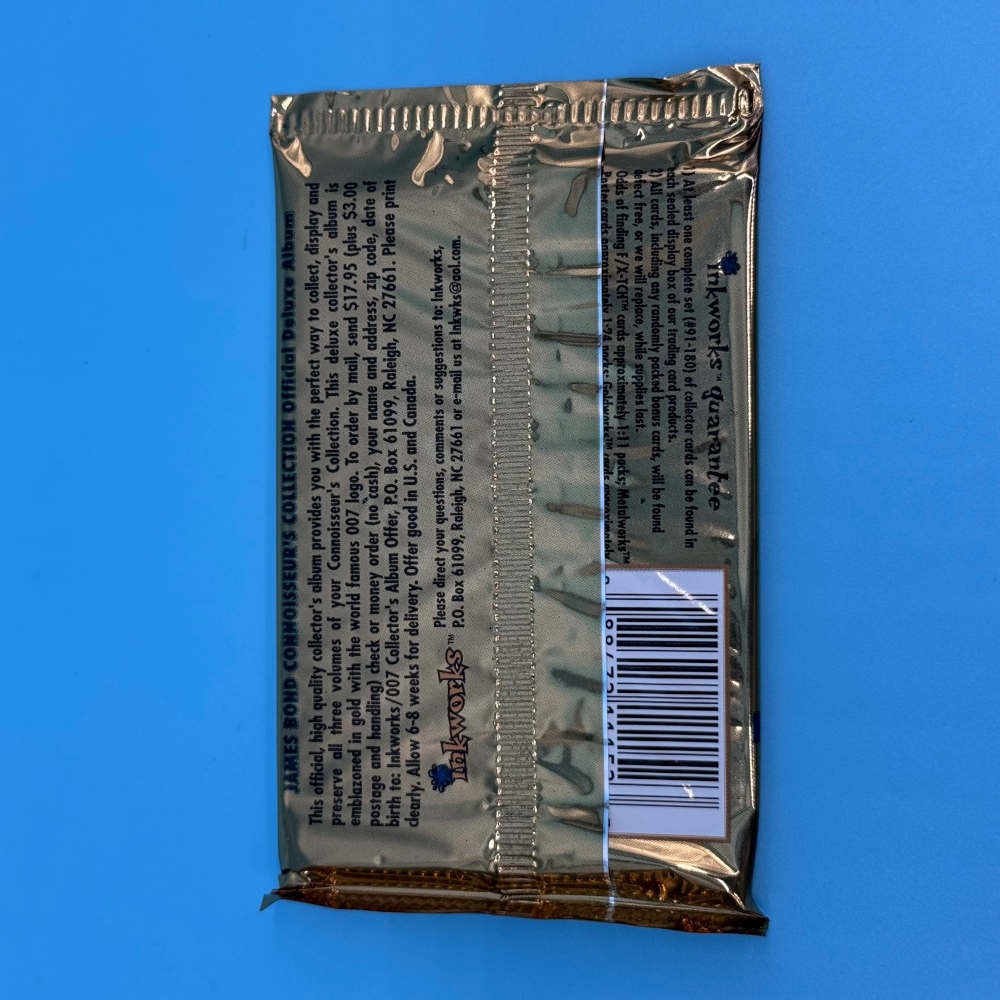 James Bond 007 The Connoisseur's Collection Volume 2: The 70s single trading card packet by Inkworks, released in 1996. This sealed packet contains 7 premium cards featuring scenes and characters from the 1970s Bond films. Look for randomly inserted F/X-TCH cards, Metalworks Poster cards, and Goldworks foil cards. Please note: pictures show both wrapper variations for this release.