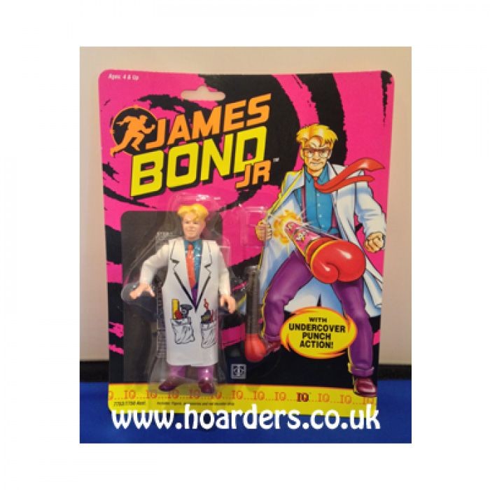 James Bond Jr IQ action figure by Hasbro (1991). Features undercover punch action and includes accessories and red decoder strip. From the animated series.