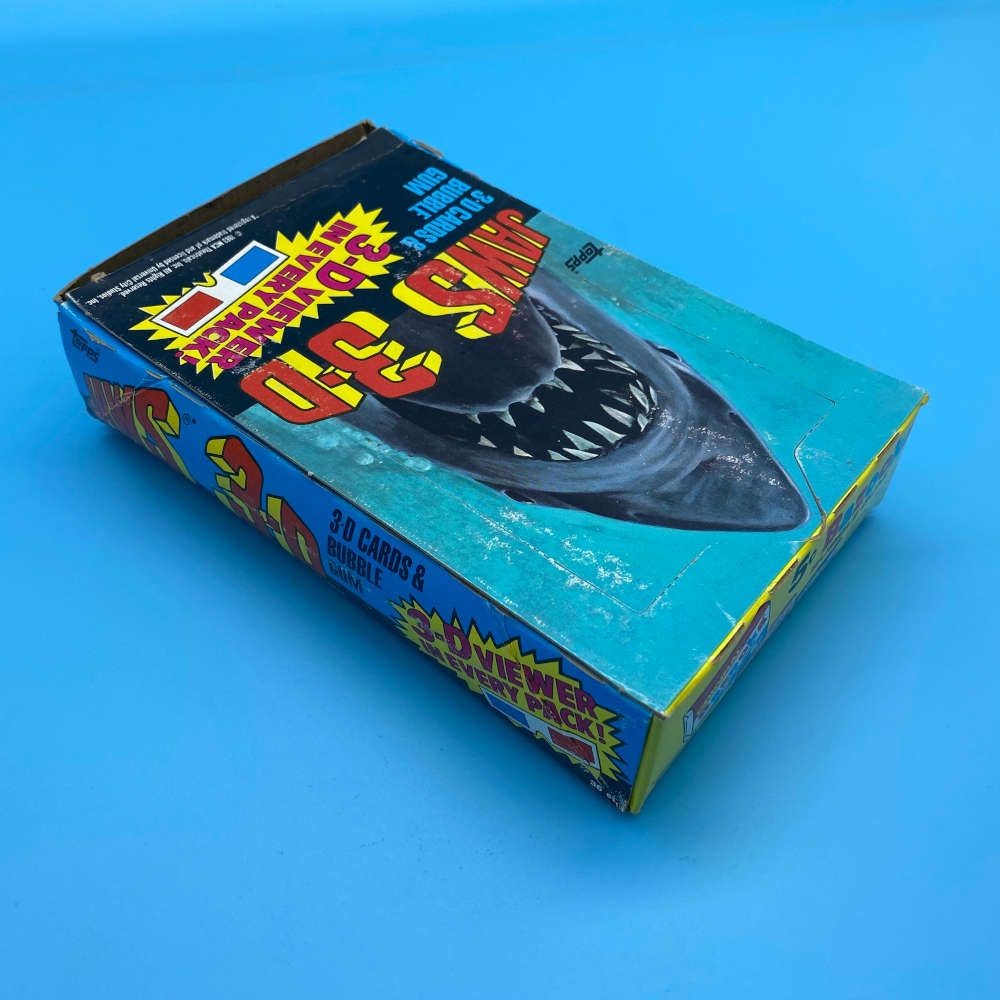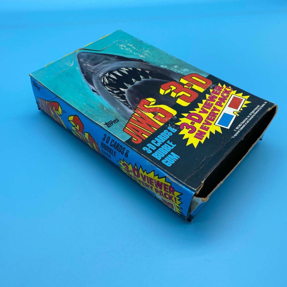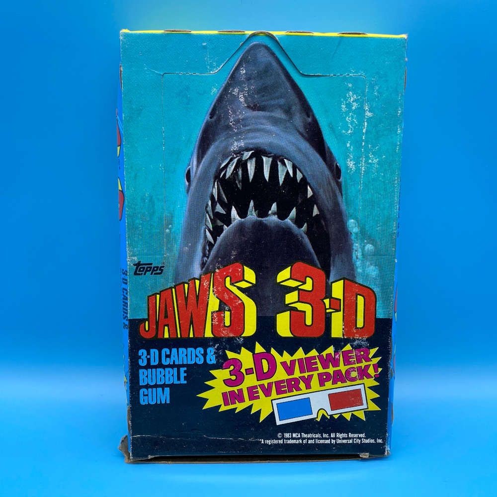 Jaws 3-D trading card box by Topps (1983). Includes 36 plastic packs with 6 cards, a 3-D viewer, and bubble gum. Single front design with 3 back adverts.