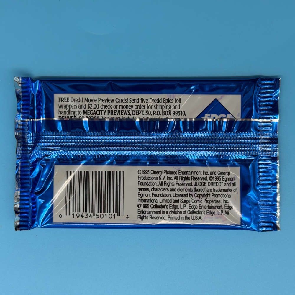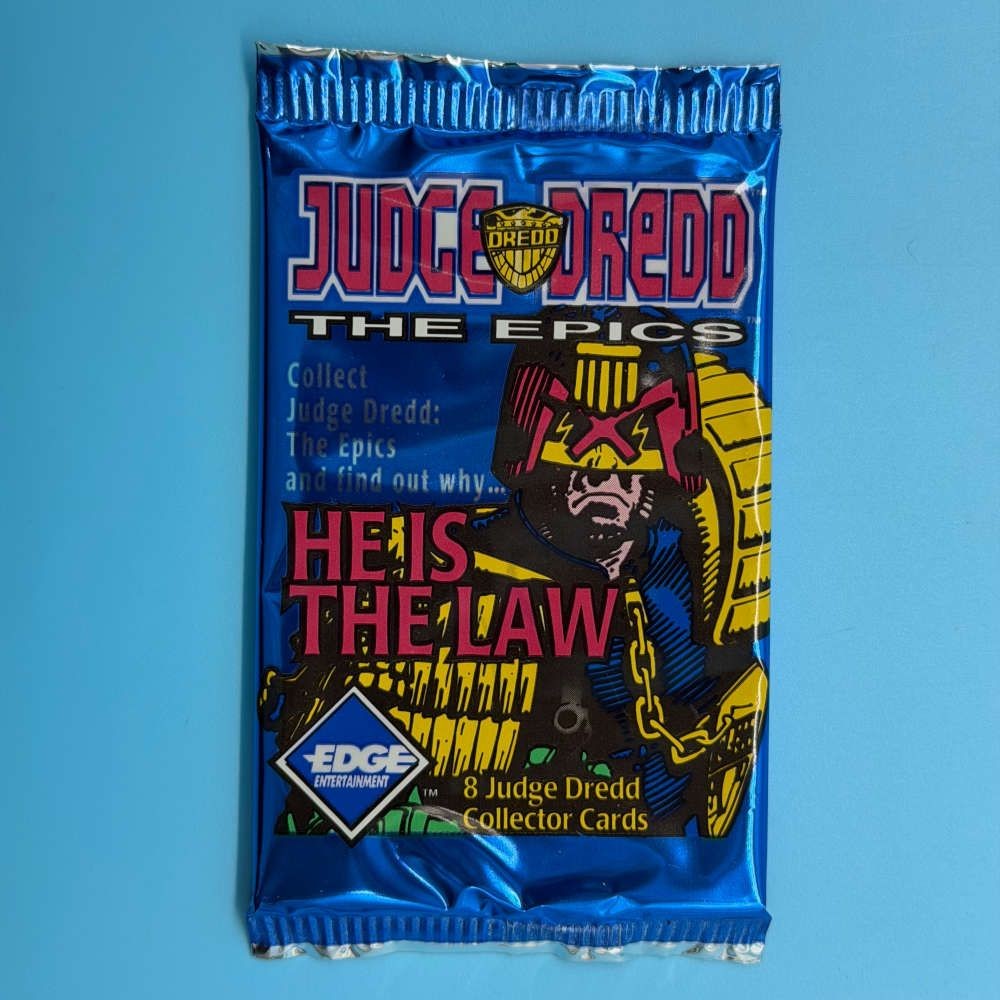Factory-sealed single packet from the Judge Dredd: The Epics trading card series, released by Edge Entertainment in 1995. Each packet contains 8 cards featuring characters and artwork from the Judge Dredd universe.